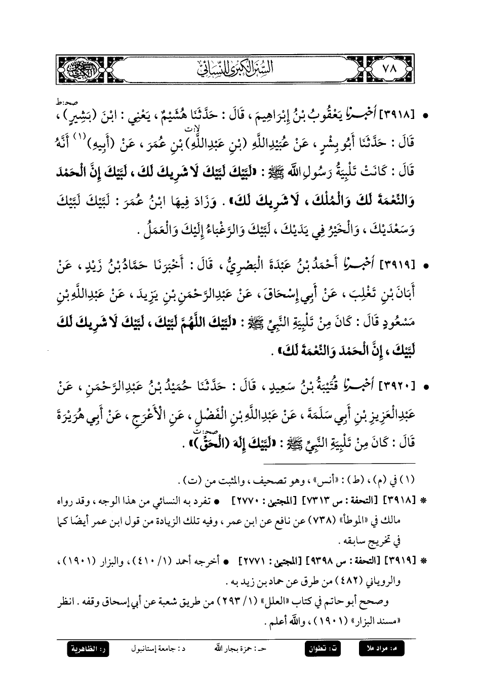 3919- أَخبَرنا أَحْمَدُ بنُ عَبدَةَ البَصْرِيُّ، قَالَ: أَخبَرنا حَمَّادُ بنُ زَيْدٍ، عَن أَبَانَ بنِ تَغْلِبَ، عَن أَبي إِسحَاقَ، عَن عَبدِ الرَّحمَنِ بنِ يَزِيدَ، عَن عَبدِ اللهِ بنِ مَسْعُودٍ قَالَ: كَانَ مِنَ تَلْبِيَةِ النَّبيِّ صَلى الله عَليه وسَلم: لَبَّيْكَ اللهُمَّ لَبَّيْكَ، لَبَّيْكَ لا شَرِيكَ لَكَ لَبَّيْكَ، إِنَّ الحَمْدَ وَالنِّعْمَةَ لَكَ.