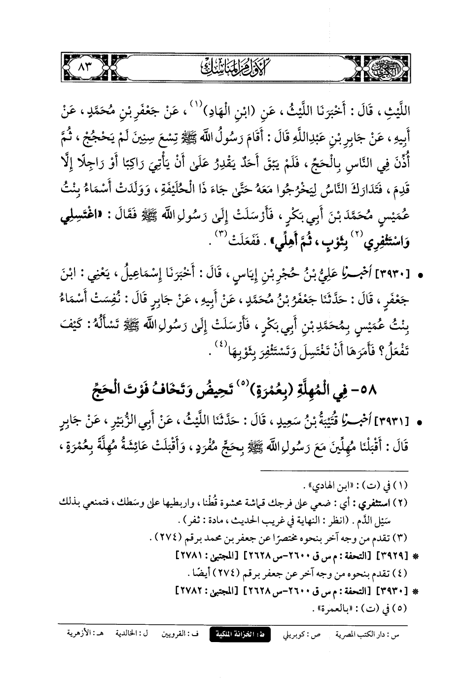 3930- أَخبَرنا عَليُّ بنُ حُجْرِ بنِ إِيَاسٍ، قَالَ: أَخبَرنا إِسمَاعِيلُ، يَعْنِي ابْنَ جَعفَرٍ، قَالَ: حَدَّثنا جَعفَرُ بنُ مُحَمدٍ، عَن أَبيهِ، عَن جَابِرٍ، قَالَ: نُفِسَتْ أَسْمَاءُ بِنْتُ عُمَيْسٍ بمُحَمدَ بْنَ أَبي بَكْرٍ، فَأَرْسَلَتْ إِلَى رَسُولِ اللهِ صَلى الله عَليه وسَلم تَسْأَلُهُ كَيْفَ تَفْعَلُ، فَأَمَرَهَا أَنْ تَغْتَسِلَ وَتَسْتَثْفِرَ بِثَوْبِهَا.