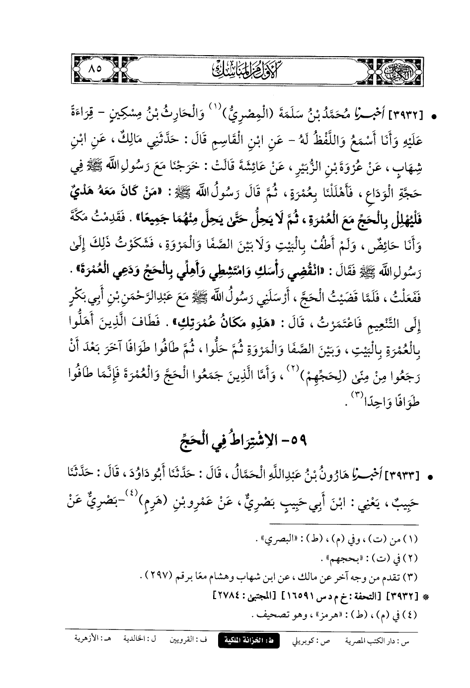 3932- أَخبَرنا مُحَمدُ بنُ سَلَمَةَ المصْرِيُّ، وَالحَارِثُ بنُ مِسْكِينٍ، قِرَاءَةً عَلَيْهِ، وَأَنَا أَسْمَعُ، وَاللَّفْظُ لَهُ، عَنِ ابنِ القَاسِمِ، قَالَ: حَدَّثني مَالِكٌ، عَنِ ابنِ شِهَابٍ، عَن عُرْوَةَ بنِ الزُّبَيْرِ، عَن عَائِشَةَ، قَالَتْ: خَرَجْنَا مَعَ رَسُولِ اللهِ صَلى الله عَليه وسَلم فِي حَجَّةِ الوَدَاعِ، فَأَهْلَلْنَا بِعُمْرَةٍ، ثُمَّ قَالَ رَسُولُ اللهِ صَلى الله عَليه وسَلم: مَنْ كَانَ مَعَهُ هَدْيٌ فَلْيُهْلِلْ بِالحَجِّ مَعَ العُمْرَةِ، ثُمَّ لا يَحِلَّ حَتَّى يَحِلَّ مِنْهُمَا جَمِيعًا، فَقَدِمْتُ مَكَّةَ وَأَنَا حَائِضٌ، وَلَمْ أَطُفْ بِالبَيْتِ وَلا بَيْنَ الصَّفَا وَالمَرْوَةِ، فَشَكَوْتُ ذَلِكَ إِلَى رَسُولِ اللهِ صَلى الله عَليه وسَلم، فَقَالَ: انْقُضِي رَأْسَكِ وَامْتَشِطِي، وَأَهِلِّي بِالحَجِّ وَدَعِي العُمْرَةَ، فَفَعَلَتْ، فَلَمَّا قَضَيْتُ الحَجَّ، أَرْسَلَنِي رَسُولُ اللهِ صَلى الله عَليه وسَلم مَعَ عَبدِ الرَّحمَنِ بنِ أَبي بَكْرٍ إِلَى التَّنْعِيمِ، فَاعْتَمَرْتُ، قَالَ: هَذِهِ مَكَانُ عُمْرَتِكِ، فَطَافَ الَّذِينَ أَهَلُّوا بِالعُمْرَةِ بِالبَيْتِ وَبَيْنَ الصَّفَا وَالمَرْوَةِ، ثُمَّ حَلُّوا، ثُمَّ طَافُوا طَوَافًا آخَرَ بَعْدَ أَنْ رَجَعُوا مِنْ مِنًى لِحَجِّهِمْ، وَأَمَّا الَّذِينَ جَمَعُوا الحَجَّ وَالعُمْرَةَ فَإِنَّمَا طَافُوا طَوَافًا وَاحِدًا.