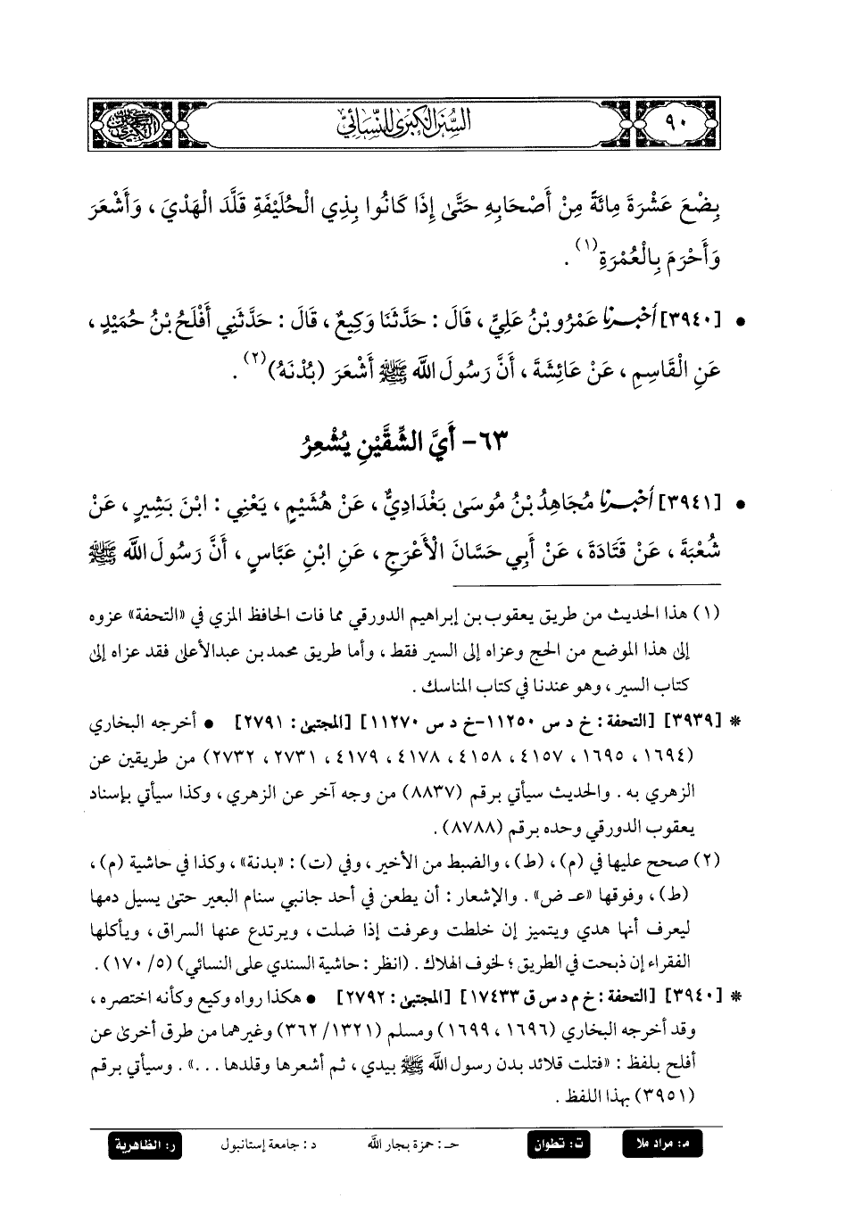 3941- أَخبَرنا مُجَاهِدُ بنُ مُوسَى، بَغْدَادِيٌّ، عَن هُشَيْمٍ، يَعْنِي ابْنَ بَشِيرٍ، عَن شُعْبَةَ، عَن قَتَادَةَ، عَن أَبي حَسَّانَ الأَعْرَجِ، عَنِ ابنِ عَبَّاسٍ، أَنَّ رَسُولَ اللهِ صَلى الله عَليه وسَلم أَشْعَرَ بُدْنَهُ مِنَ الجَانِبِ الأَيْمَنِ، وَسَلَتَ الدَّمَ عَنهَا وَأَشْعَرَهَا.