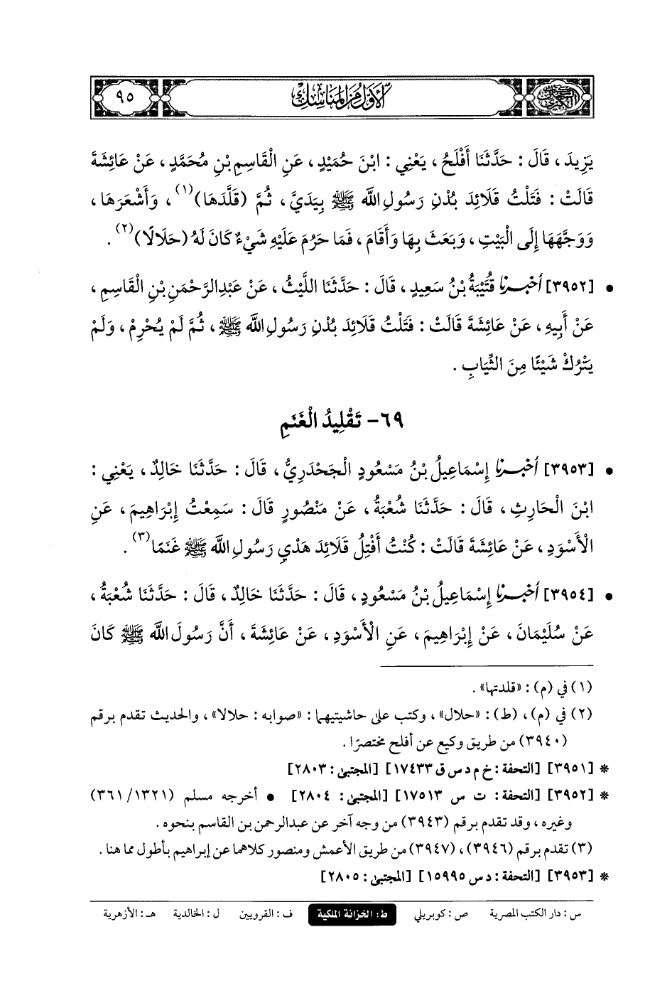 3954- أَخبَرنا إِسمَاعِيلُ بنُ مَسْعُودٍ، قَالَ: حَدَّثنا خَالِدٌ، قَالَ: حَدَّثنا شُعْبَةُ، عَن سُلَيمَانَ، عَن إِبرَاهِيمَ، عَنِ الأَسْوَدِ، عَن عَائِشَةَ، أَنَّ رَسُولَ اللهِ صَلى الله عَليه وسَلم كَانَ يُهْدِي الغَنَمَ وَيُقَلِّدُهَا.