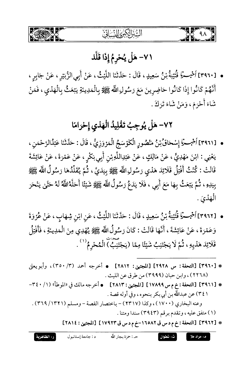 3960- أَخبَرنا قُتَيبَةُ بنُ سَعِيدٍ، قَالَ: حَدَّثنا اللَّيْثُ، عَن أَبي الزُّبَيْرِ، عَن جَابِرٍ، أَنَّهُمْ كَانُوا إِذَا كَانُوا حَاضِرِينَ مَعَ رَسُولِ اللهِ صَلى الله عَليه وسَلم بِالمَدِينَةِ يَبْعَثُ بِالهَدْيِ، فَمَنْ شَاءَ أَحْرَمَ، وَمَنْ شَاءَ تَرَكَ.
