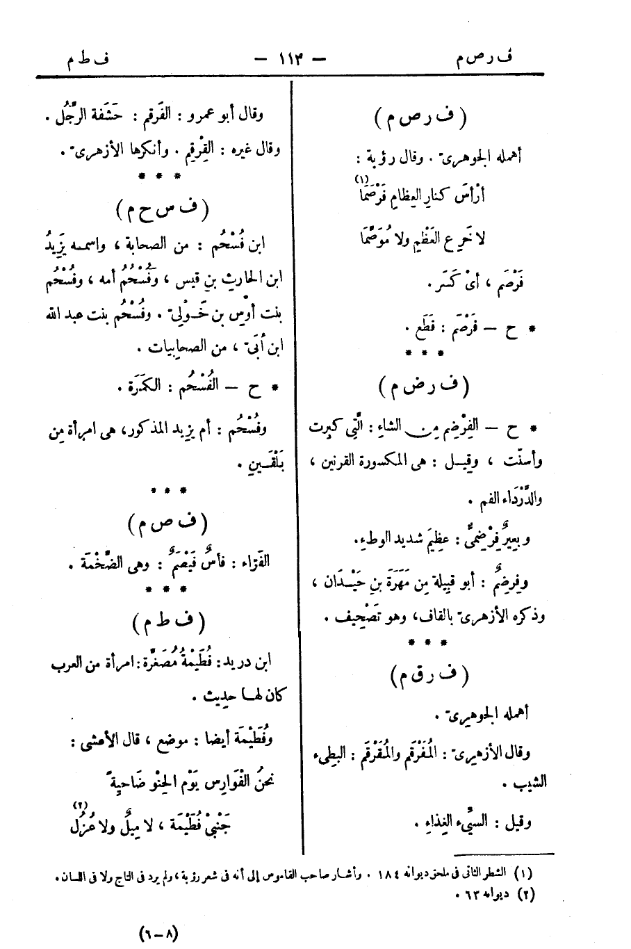* ح - الفِرْضِم مِن الشاءِ: الّتِي كبِرت وأسنّت، وقِيل: هي المكسورة القرنين، والدَّرْدَاء الفم.