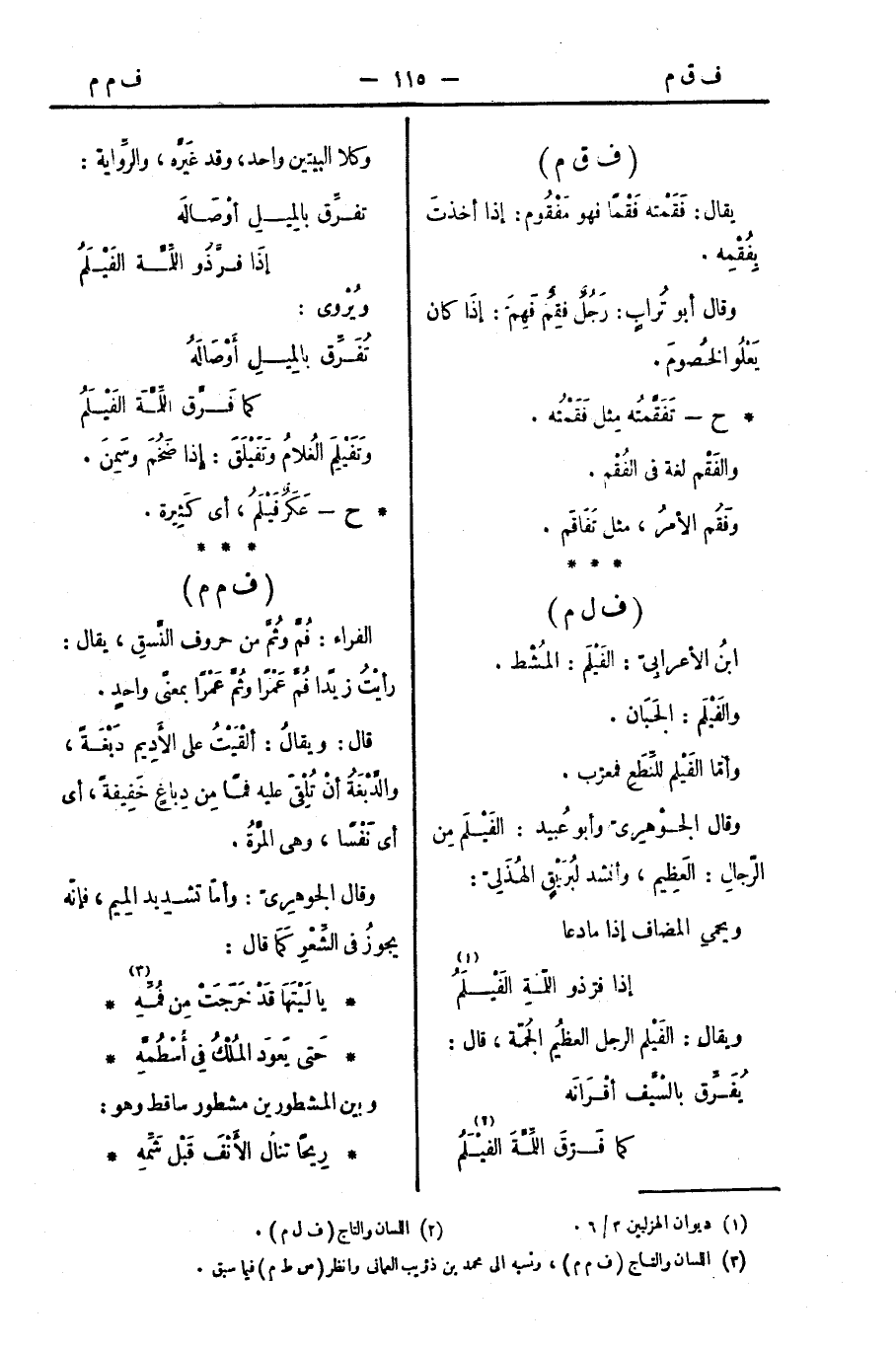 الفراء: فُمَّ وثُمَّ من حروف النَّسقِ، يقال: رأيْتُ زيدًا فُمَّ عَمْرًا وثُمَّ عَمْرًا بمعنًى واحدٍ.