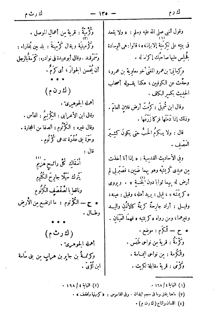 وفِي الأحاديث القدسِية: "إذا أنا أخذت مِن عبدِي كَريمتيْه وهو بِهما ضَنِين، فصَبَر لِي لم أرض له بِهِما ثوابا دون الجنةِ". ويروى "كريمَتَه"، قِيل: يريد أهله، وقيل: عينه، وقيل: أراد جارِحةً كريمةً كالأذُنِ واليد وغيرهما، ومن رواه "كريمتيه" فهمَا العَيْنَانِ.