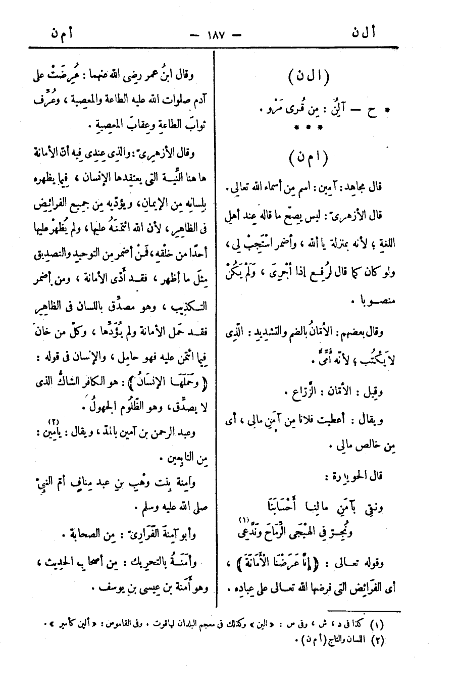 وقال الأزهرِيّ: والذِي عِندِي فِيه أنّ الأمانة ها هنا النِّية التي يعتقِدها الإنسان، فِيما يظهره بلِسانِهِ مِن الإيمانِ، ويؤدِّيه مِن جمِيع الفرائِضِ في الظاهِرِ، لأن الله ائتَمنَهُ عليها، ولم يُظهْر عليها أحدًا من خلْقهِ، فَمنْ أضمر من التوحيدِ والتصدِيق مِثلَ ما أظهر، فقد أَدَّى الأمانة، ومن أضمر التكذيب، وهو مصدِّق باللسان في الظاهِرِ فقد حَمل الأمانةْ ولم يُؤَدِّها، وكلّ من خان فيما ائتمن عليه فهو حامِل، والإنسان في قوله: {وَحَمَلَهَا الإنسَانُ}: هو الكافر الشاكُّ الذي لا يصدِّق، وهو الظّلُوم الجهولُ.