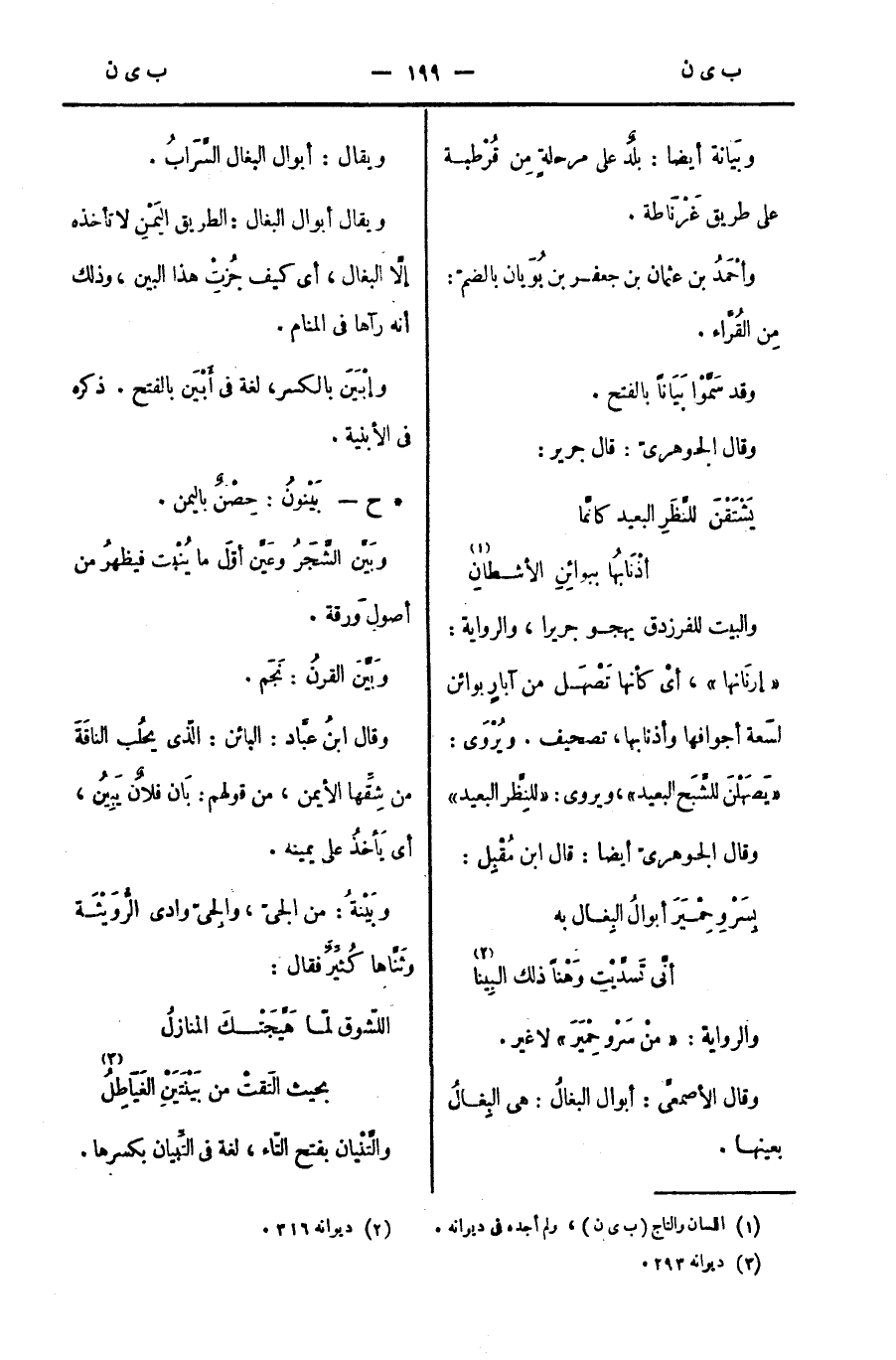 وقال ابنُ عبَّاد: البائن: الّذي يحلُب الناقَةَ من شِقِّها الأيمن، من قولهم: بَانَ فلانٌ يَبِينُ، أي يَأْخُذ على يمينة. وبَيْنةُ: من الجيّ، والجِيّ وادي الرُّوَيْثَة وثَنَّاها كُثَيِّرٌ فقال:
