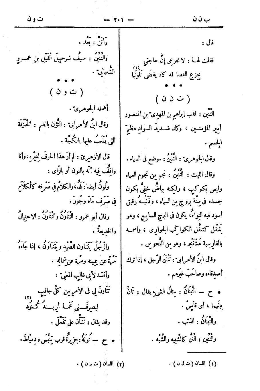 وقال الليث: التِّنِّينُ: نجم مِن نجوم السماء وليس بكوكبٍ، ولكِنه بياضٌ خفيٌّ يكون جسده في سِتَّة بروجٍ مِن السماء، وَذَنْبُهُ رقيق أسود فيه التواءٌ، يكون في البرجِ السابِعِ، وهو ينتقَّل كتنقُّل الكواكِب الجوارِي، واسمه بالفارِسِية هَشْتَنْبر، وهو مِن النُّحوسِ.
