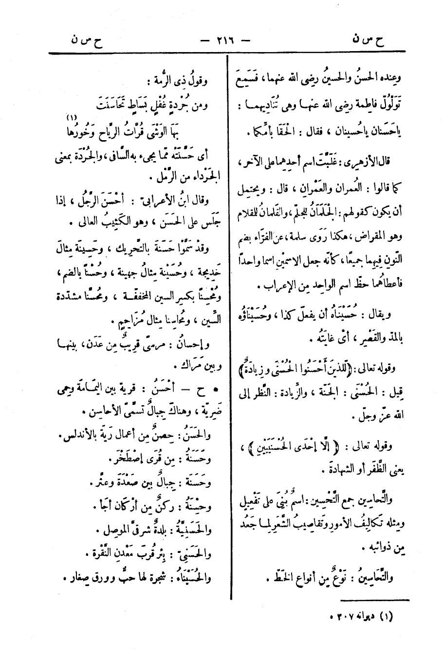 *ح - أحْسَنُ: قرية بين اليَمامَة وحِمى ضَرِيّة، وهناكَ جِبالٌ تسمَّى الأحاسِن.