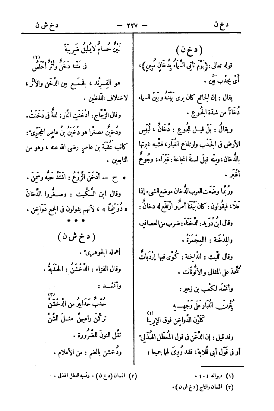 *ح - أدْخَنَ الزَّرْعُ: اشْتَدَّ حَبُّه وسَمِنَ. وقال ابن السِّكِّيت: وصغُّروا الدُّخانَ "دُوَيْخِنًا"، لأنهم يقولون في الجمع دَوَاخِن.