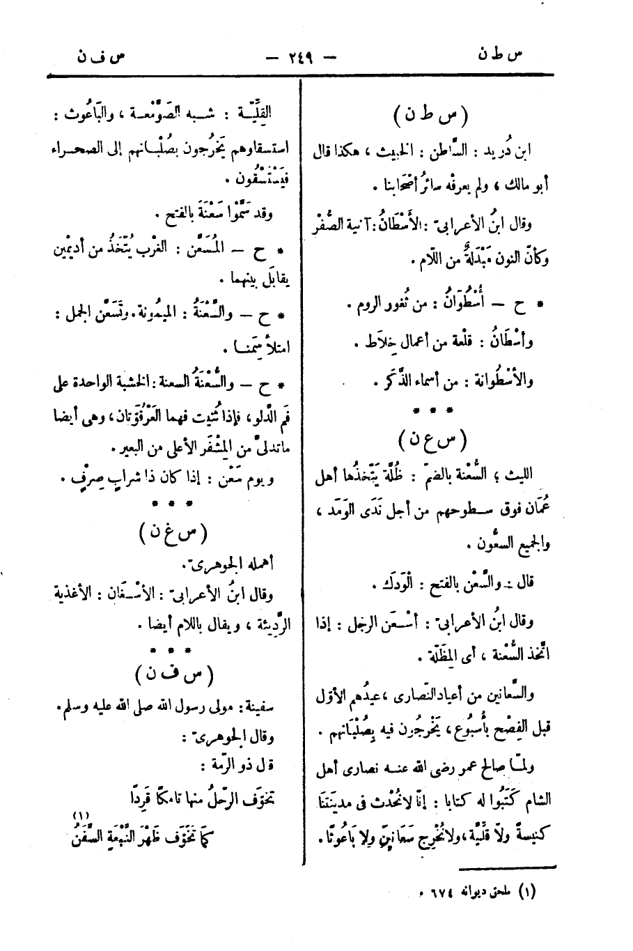 ابن دُريد: السَّاطن: الخبيث، هكذا قال أبو مالك، ولم يعرفْه سائرُ أصْحَابنا.