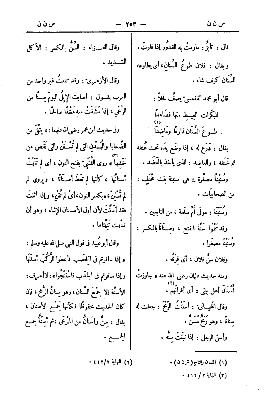 وفي حديث ابن عمر رضي الله عنهما: "يتَّقَى من الضَّحايا والبُدْنِ التي لم تُسْنَنْ والتي نَقَص من خَلْقِها" روى القُتَبِيّ فتح النون، أي لم تَنْبُتْ أسنانُها، كأنها لم تعْطَ أسنَانًا، ويروى لم لم تُسْنِنْ، "بكسر النون، أيْ لم تُثْنِ، وإذا أثنتَ فقد أسَنَّتْ لأن أول الأسنان الإثناء، وهو أن تنْبت ثَنِيَّتاها.