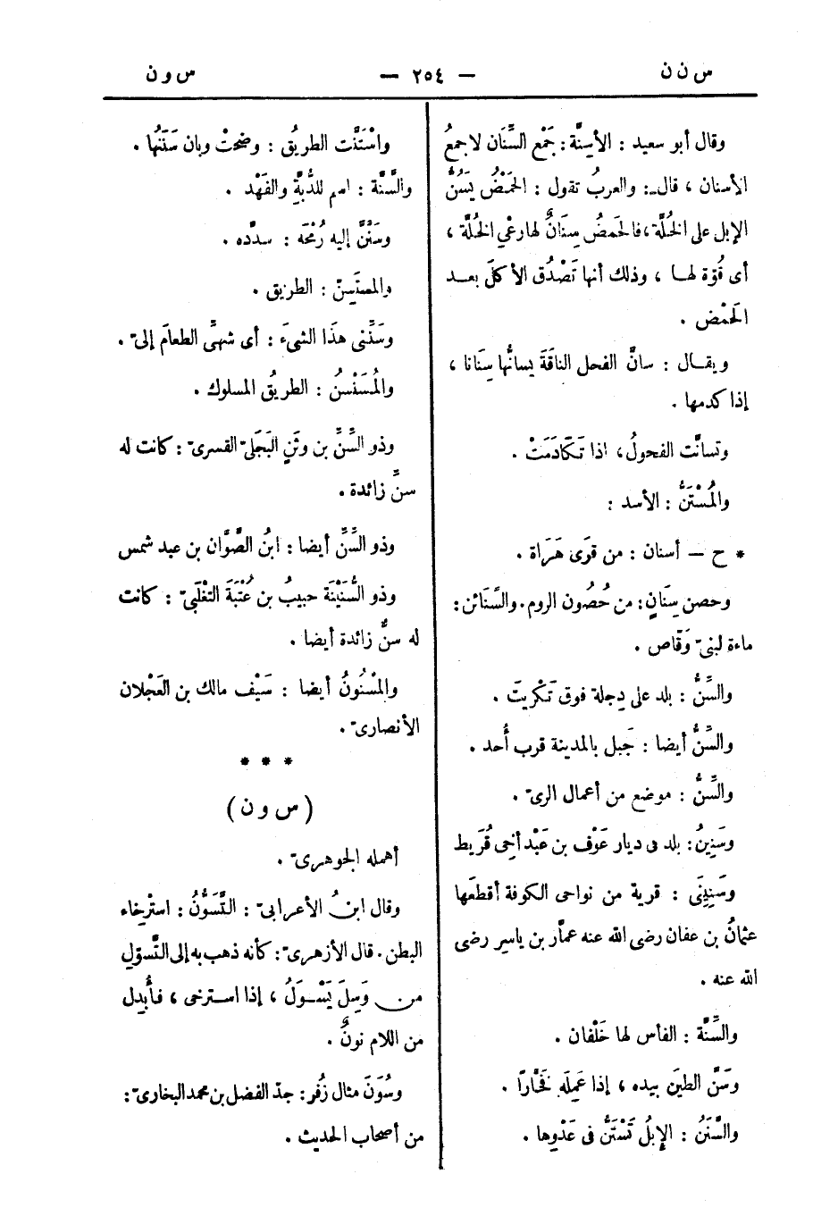 وقال أبو سعيد: الأسِنَّة: جَمْع السِّنَان لا جمعُ الأسنان، قال: والعربُ تقول: الحَمْضُ يَسُنُّ الإبل على الخُلَّة، فالحَمْضُ سِنَانٌ لها رعْيِ الخُلَّة، أي قُوّة لها، وذلك أنها تَصْدُق الأكلَ بعد الحَمْض.