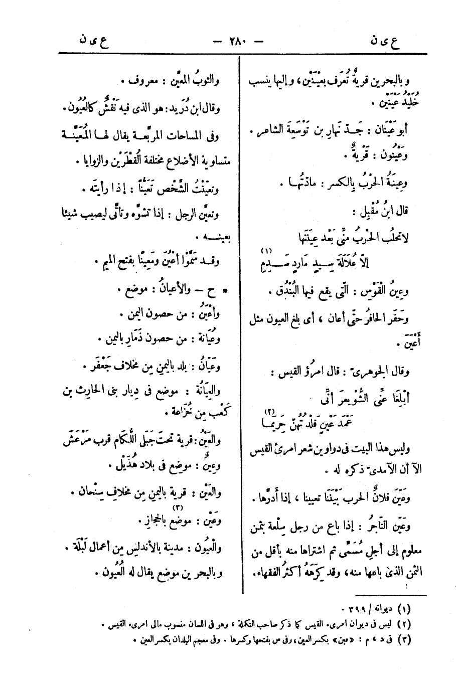 والعَيْنُ: قرية تحتَ جَبَلي اللُّكَام قرب مَرْعَشَ، وعِينٌ: موضِع في بلاد هُذَيْل.