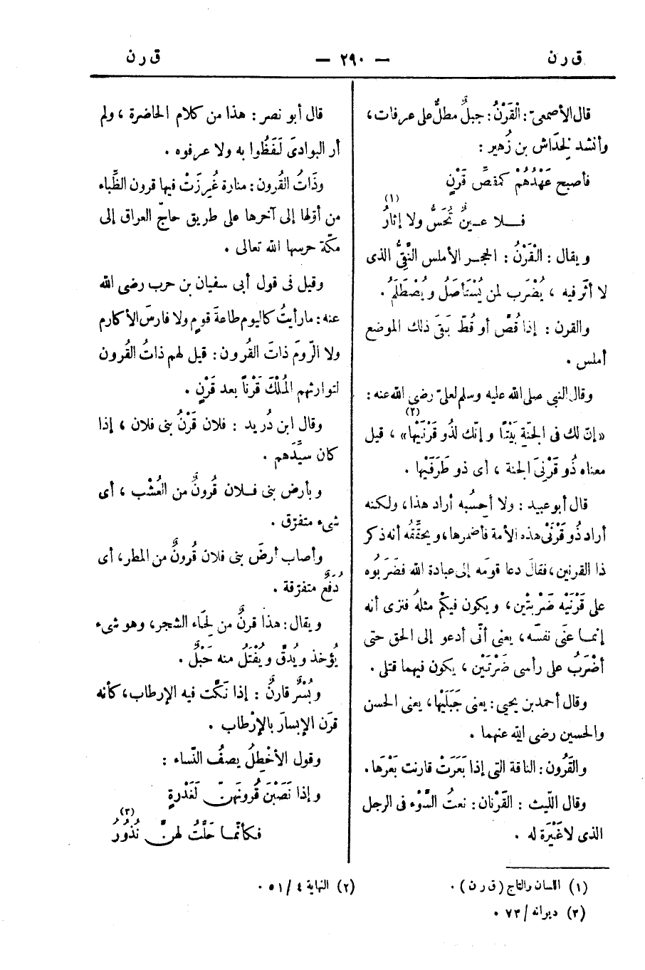 وقال الأصمعيّ: القَرْنُ: جبلٌ مطلٌّ على عرفات، وأنشد لِخدَاش بن زُهير:
