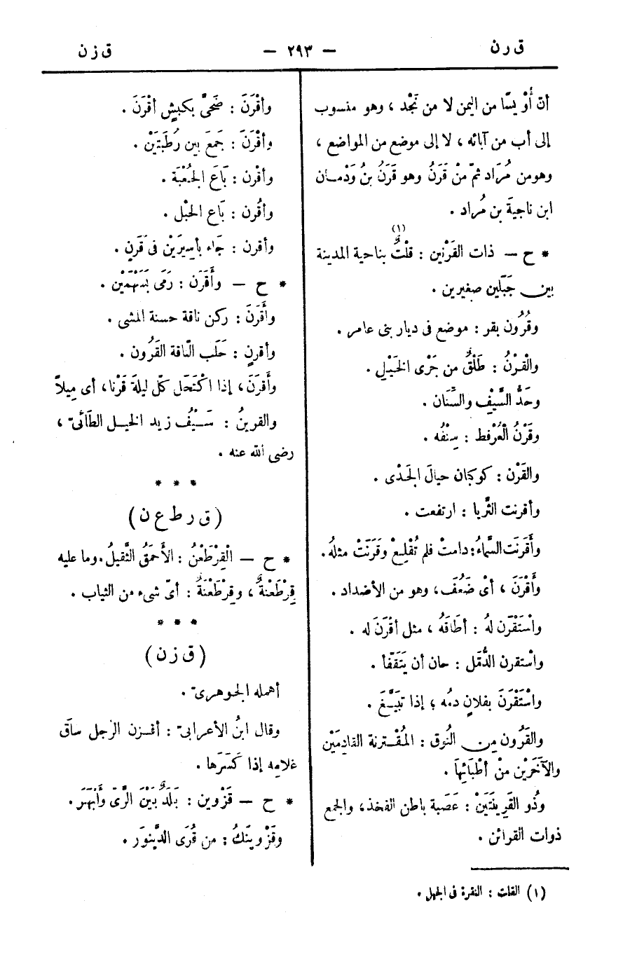 والقَرُون من النُوق: المُقْترنة القادِمَيْن والآخَريْن منْ أطْبَائِهَا.