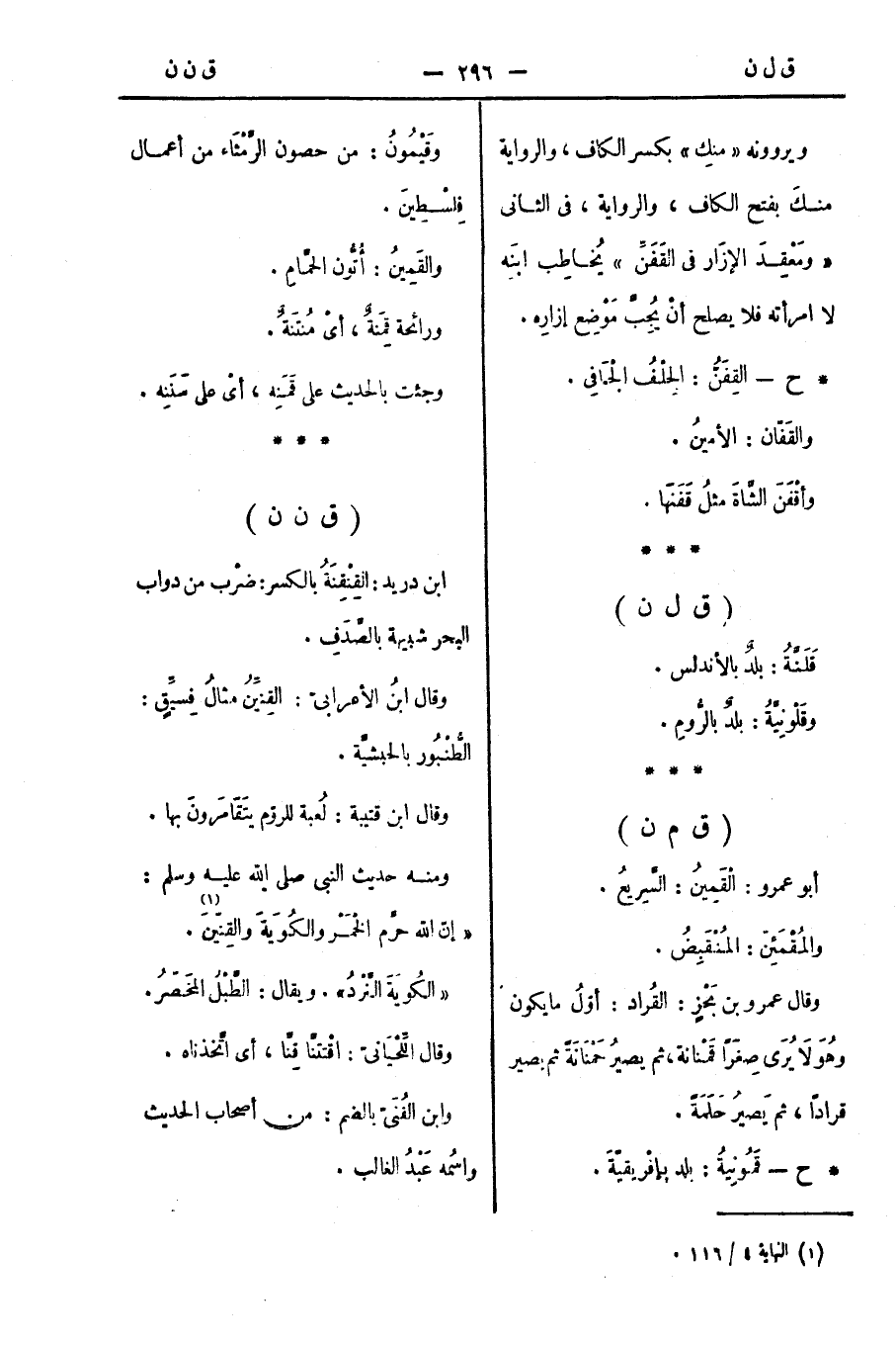 ومنه حديث النبي صلى الله عليه وسلم: "إنّ الله حرَّم الْخَمْر والكُوَيةَ والقِنَينَ.