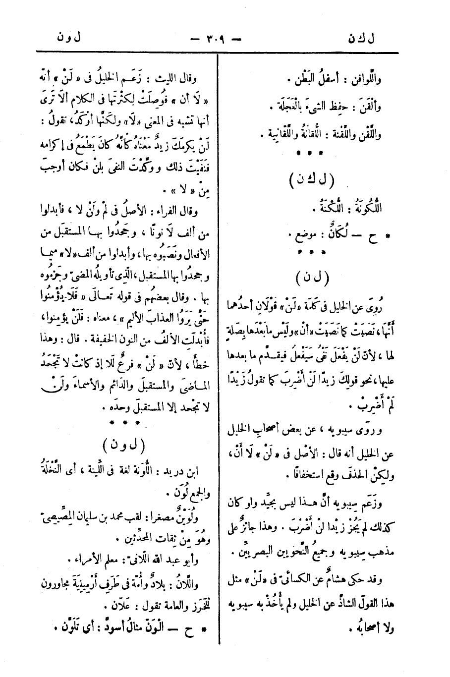 وقال الليث: زَعَم الخليلُ في "لَنْ" أنّه "لَا أن" فُوصِلَتْ لكثْرَتها في الكلام ألَا تَرَى أنها تشبه في المعنى "لَا" ولكنَّها أوْكَدُ، تقولُ: لَنْ يكرمَكَ زيدٌ مَعْنَاهُ كأنَّهُ كانَ يَطْمَعُ في إكرامه فنَفَيْتَ ذلك ووكَّدْتَ النفيَ بلنْ فكان أوجبَ مِنْ "لا".