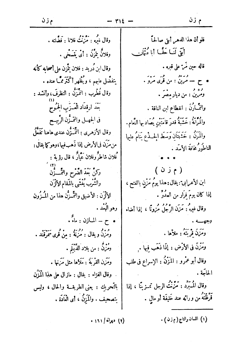 وقال الفرّاء: يقال: ما زال على هذا الْمَزَّن بالتّحريكِ: يعني الطريقة والحال، وليس بتصحيف. والْمَزِنُ، أي الْعَادَة.