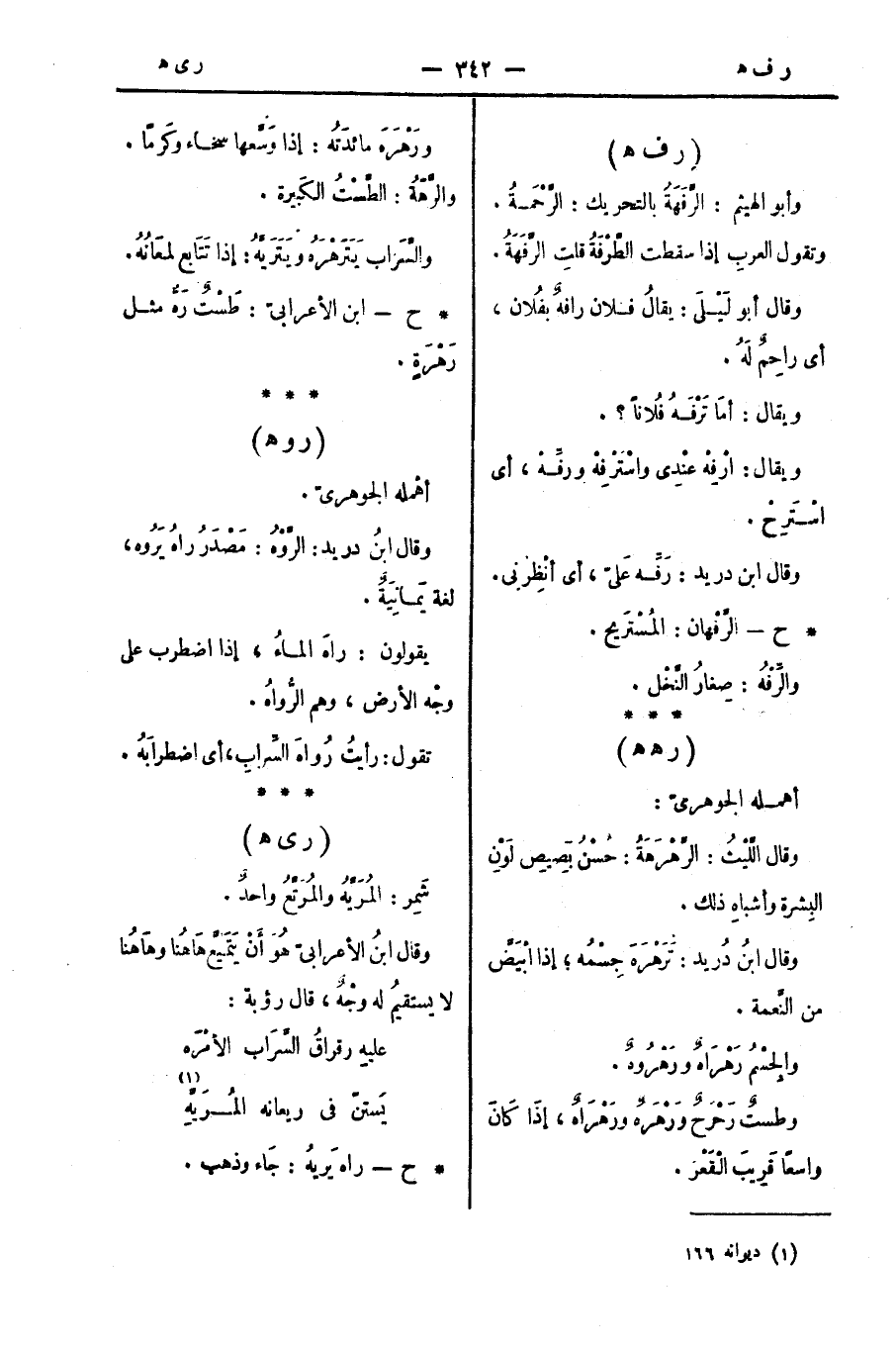 وقال ابنُ دريد: الرَّوْهُ: مَصْدَرُ راهُ يَرُوه، لغة يمَانِيَةٌ.