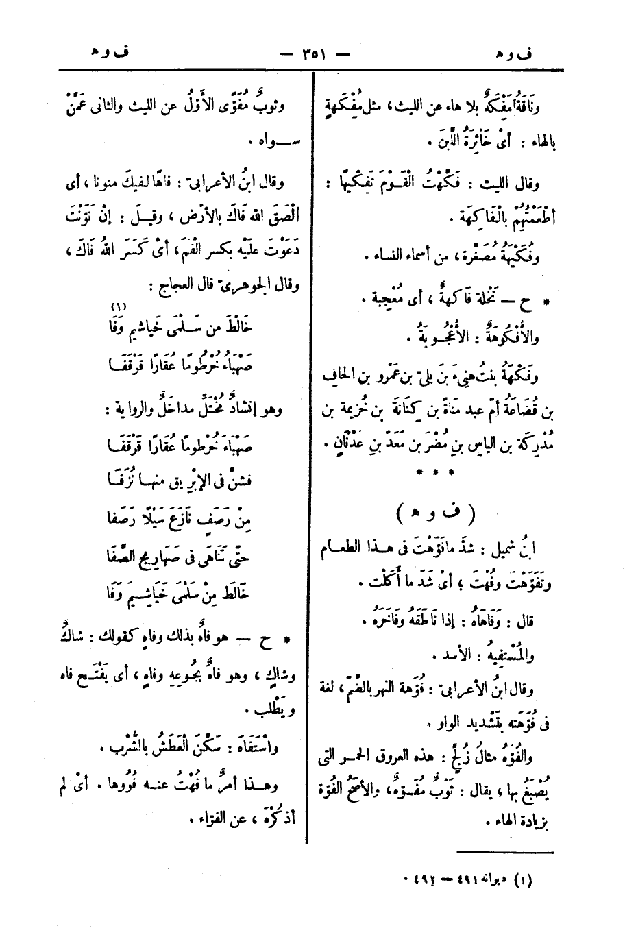 *ح - هو فاهٌ بذلك وفاهٍ كقولك: شاكٌ وشاكٍ، وهو فاهٌ بجُوعِهِ وفاهٍ، أي يَفْتَح فاه ويَطْلب.