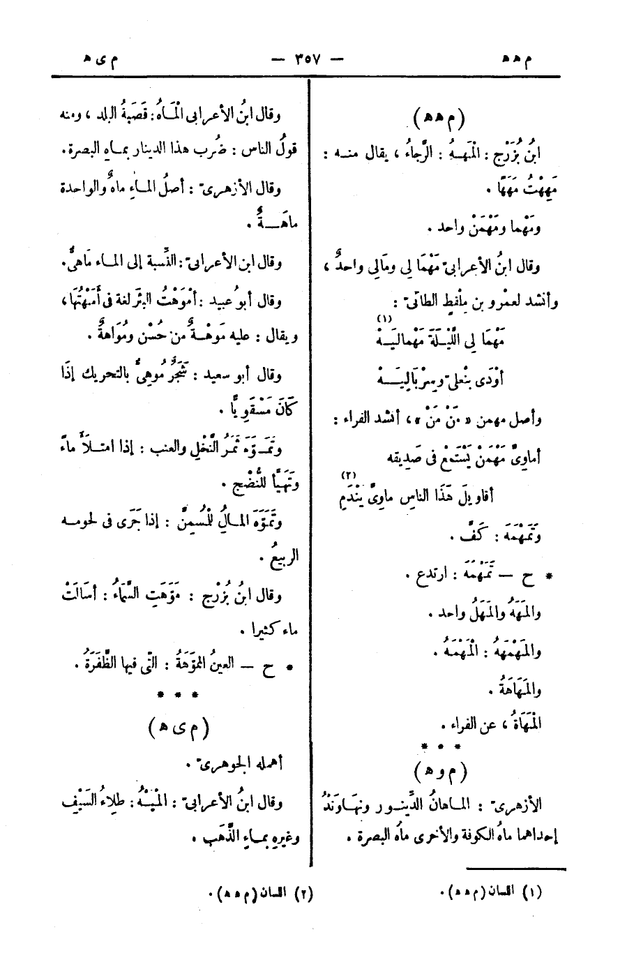 وقال الأزهريّ: أصلُ الماءِ ماهٌ والواحدةماهَةٌ.