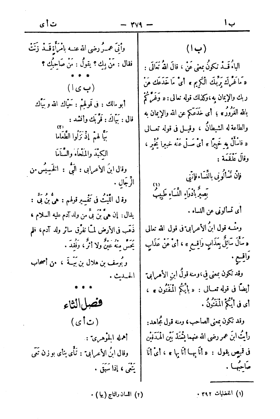 وقد تكون معنى فِي، ومنه قولُ ابنِ الأعرابيّ أيضًا في قوله تعالى: {بأيِّكُم الْمَفْتُون}، أي في أَيِّكُمْ الْمَفْتُونُ.
