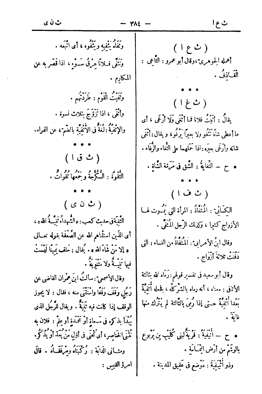 وقال الأصمعيّ: سألتُ ابنَ عِمْران القاضي عن رَجُل وَقَفَ وَقْفًا واسْتَثْنَى منه، فقال: لا يجوز الوقف إذا كانت فيه ثَنِيّةٌ. ويقال للرَّجُل الذي يُبْدَأ بذكره في مَسعاةٍ أو مَحْمَدةٍ أو عِلْم: فلان به تُثْنَى الخَنَاصِر، أي تُحْنَى في أوّلِ مَنْ يُعَدّ أو يُذْكَرُ.