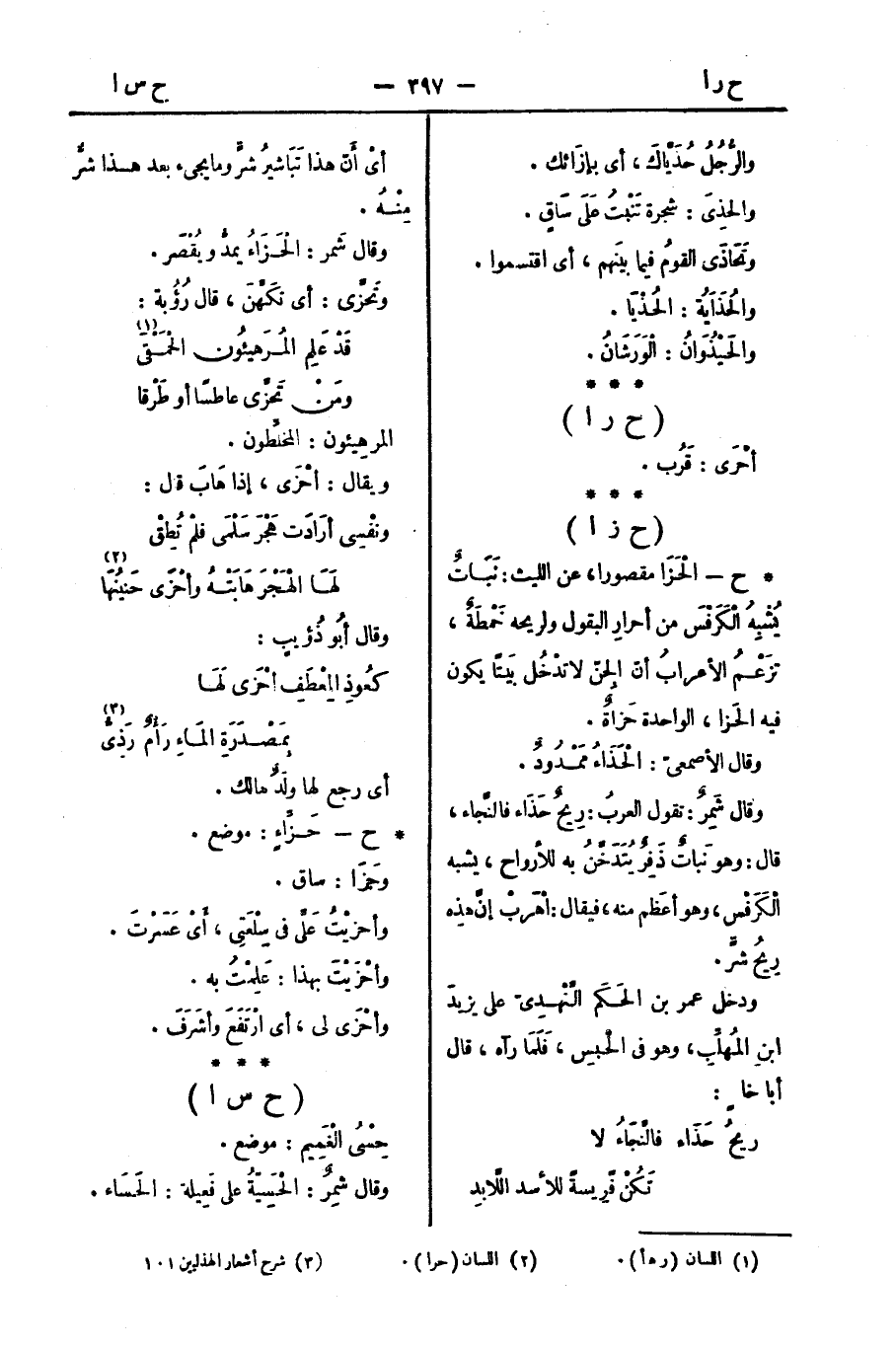 *ح - الْحَزَا مقصورا، عن الليث: نَبَاتٌ يُشْبِهُ الْكَرَفْسَ من أحرارِ البقول ولريحه خَمْطَةٌ، تَزْعُم الأعرابُ أنّ الجِنّ لا تدْخُل بَيتًا يكون في الحَزا، الواحدة حَزاةٌ.