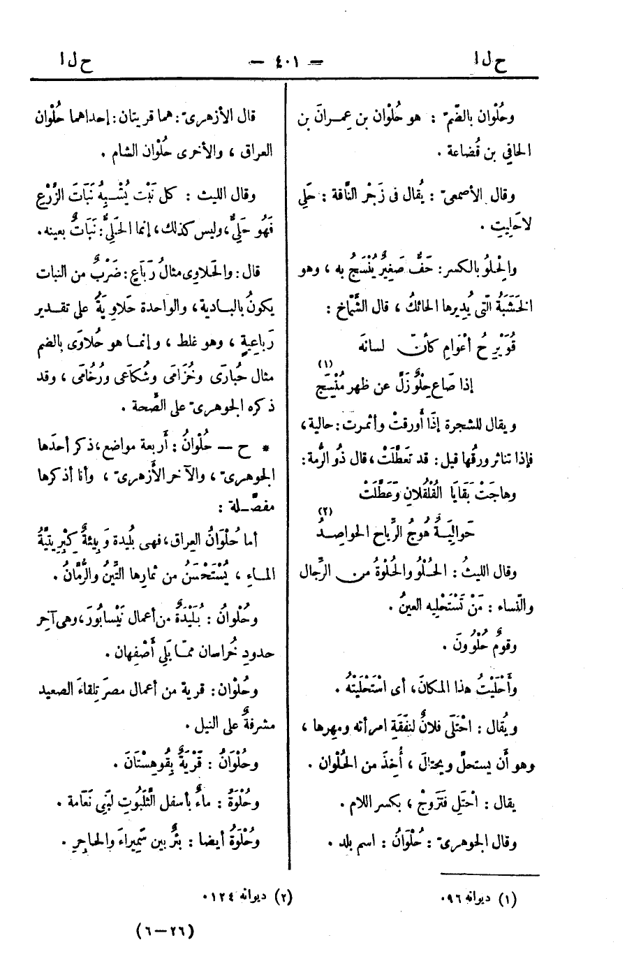 قال الأزهريّ: هما قريتان: إحداهما حُلْوان العراق، والأخرى حُلْوان الشام.