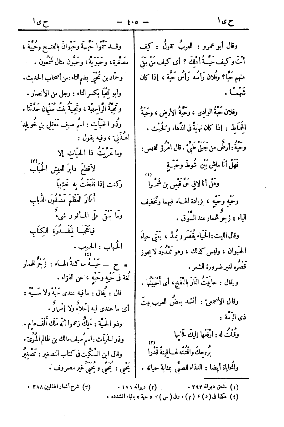 وقال أبو عمرو: العربُ تقولُ: كيف أنْتَ وكيف حَيَّةُ أهْلِكَ؟ أي كيف مَنْ بَقَى منهم حَيًّا؟ وفُلان رَأسُه رَأسُ حَيُّة، إذا كان شَهْمًا.