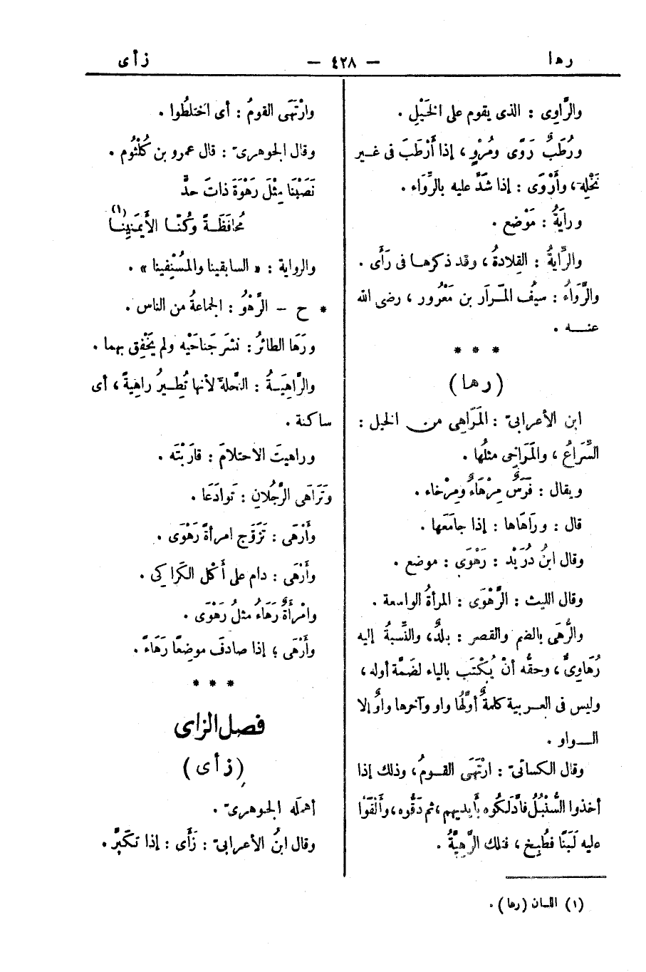 والرُّهَى بالضم والقصر: بلدٌ، والنِّسبةُ إليه رُهَاوِيٌّ، وحقُّه أنْ يُكْتَب بالياء لضَمِّة أوله، وليس في العربية كلمةٌ أوَّلُها واوٌ وآخرها واوٌ إلا الواو.