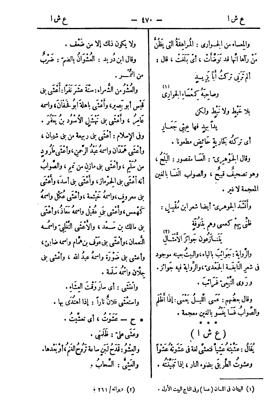 والعُشْوُ من الشُّعراء: ستّةَ عَشَرَ نَفَرًا: أَعْشَى بني قَيْس أبو بَصِير، وأَعْشَى باهلةَ أبُو قَحْفَانَ، واسمه عَامِرُ، وأَعْشَى بني نَهْشَلٍ الأسْودُ بن يَعْفُرَ وفي الإسلام: أعْشَى بني ربيعة من بني شيبان، وأعْشَى هَمْدَان واسمهُ عَبْدُ الرَّحمنِ، وأعْشَى طَرُودٍ من سُلَيْم، وأعْشَى بني مازِن من تميم، والصَّوابُ أنه أعشى بني الحِرْماز، وأَعْشَى بني أسدَ، وأَعْشَى بني معروفٍ، واسمهُ خَيْثمة، وأعْشَى عُكْل واسمهُ كَهْمس، وأَعْشى بنِي عُقيْل: واسمهُ مَعَاذُ، وأعْشَى بني مالك بن سَعْد، والأَعْشَى التَّغْلبيّ واسمُه النُّعمان، وأَعْشَى بني عَوْف بن همَّام واسمه ضابئ، وأعشى بني ضَوْرَة واسمُه عبدُ الله، وأعْشى نبي جِلَّان واسْمُه سَلَمة.