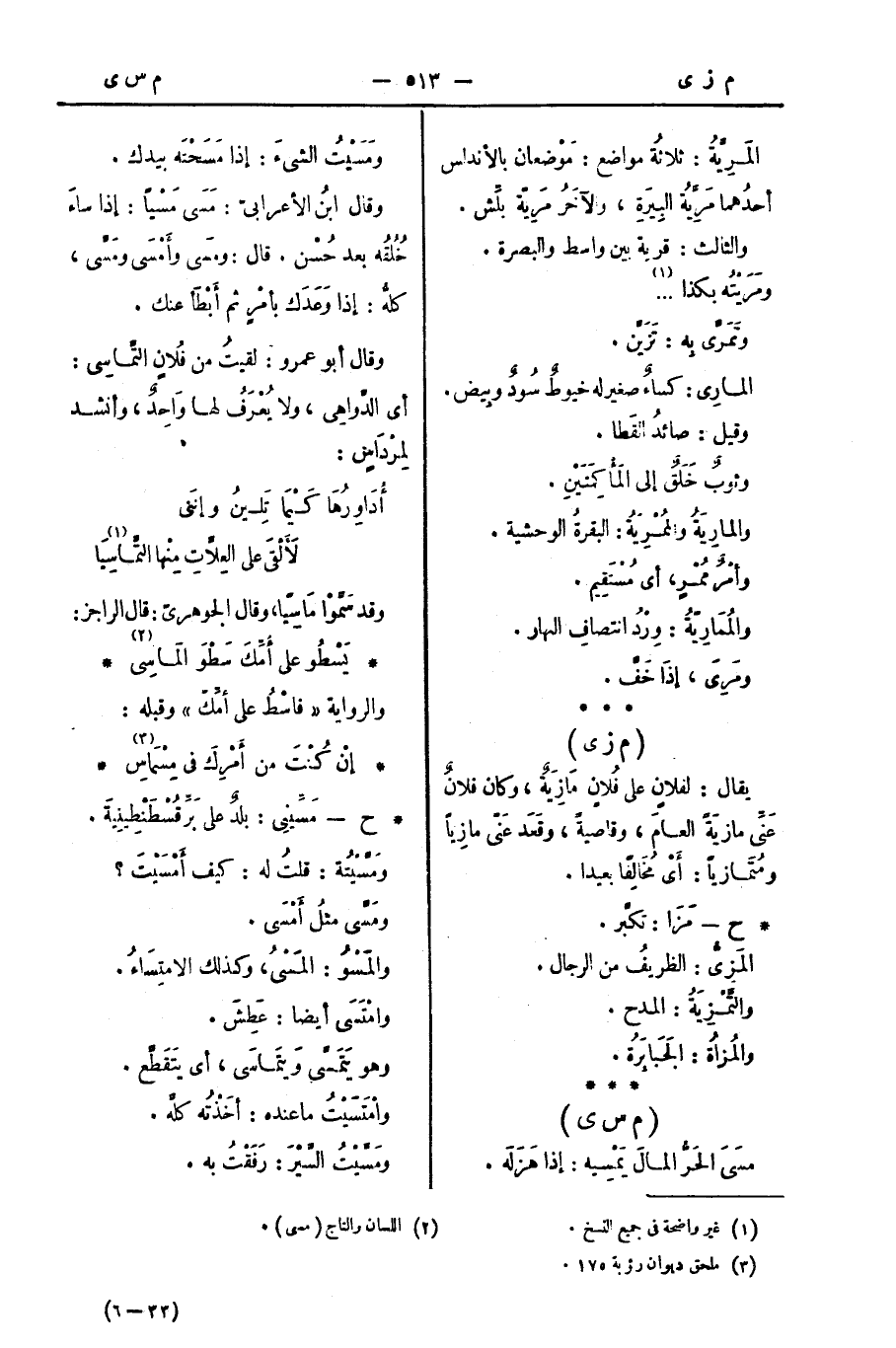يقال: لفلانٍ على فُلانٍ مَازِيَةٌ، وكان فلانٌ عَنِّي مازيَةَ العامَ، وقاصيةً، وقَعَد عَنِّي مازِيًا ومُتَمازيًا: أي مُخَالِفًا بعيدا.