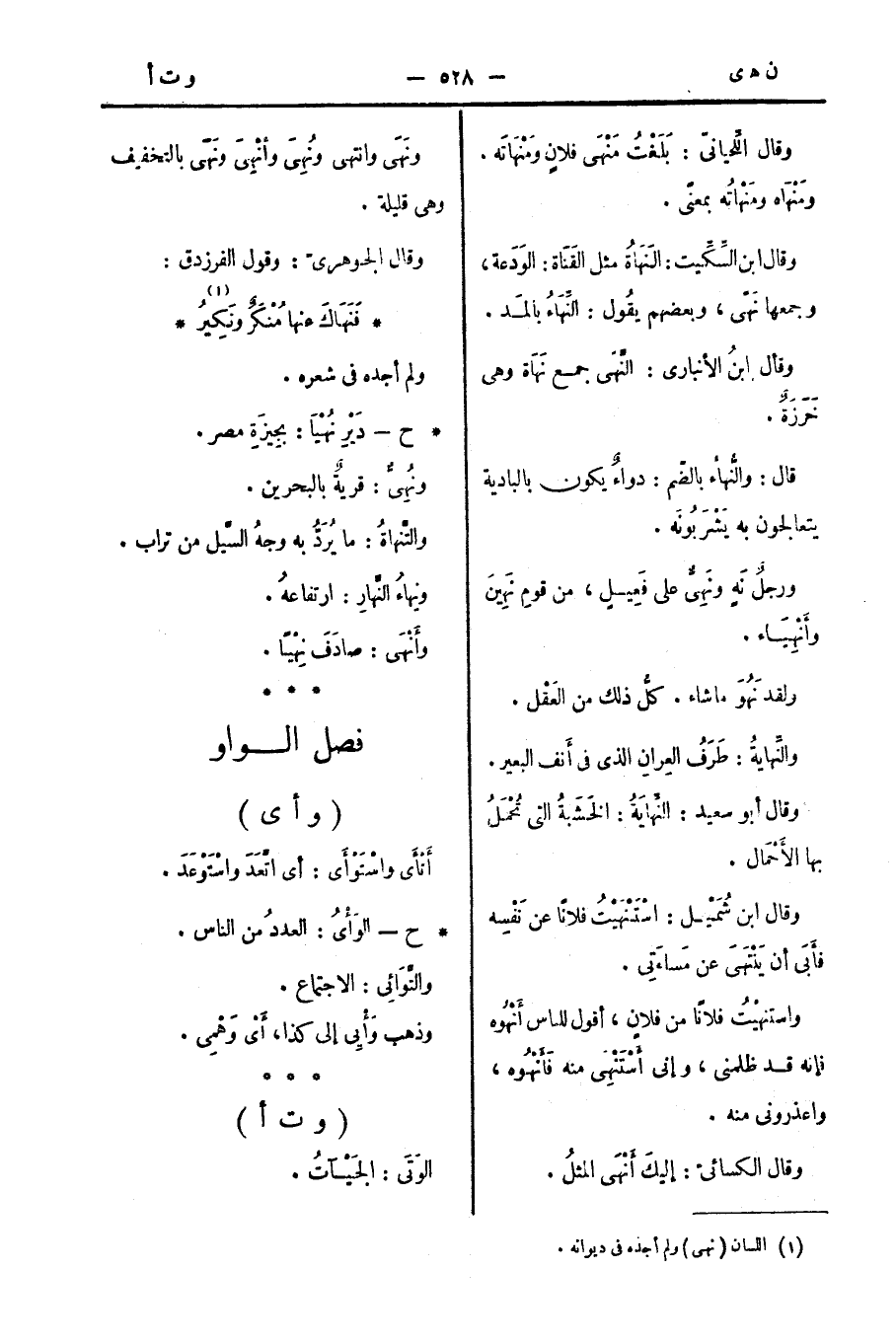 وقال ابن السِّكِّيت: النَهَاةُ مثل القَنَاة: الوَدَعة، وجمعها نَهّى، وبعضهم يقُول: النِّهَاءُ بالمَد.