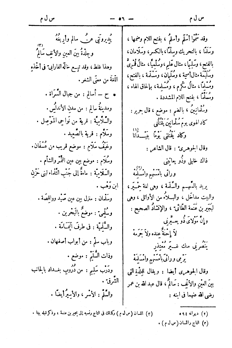وقال الجوهري أيضا: ويقال للجِلْدَة التي بينَ العيْنِ والأنْفِ: سَالمٌ، قال عبد الله بن عمر رضي الله عنهما في ابنه: