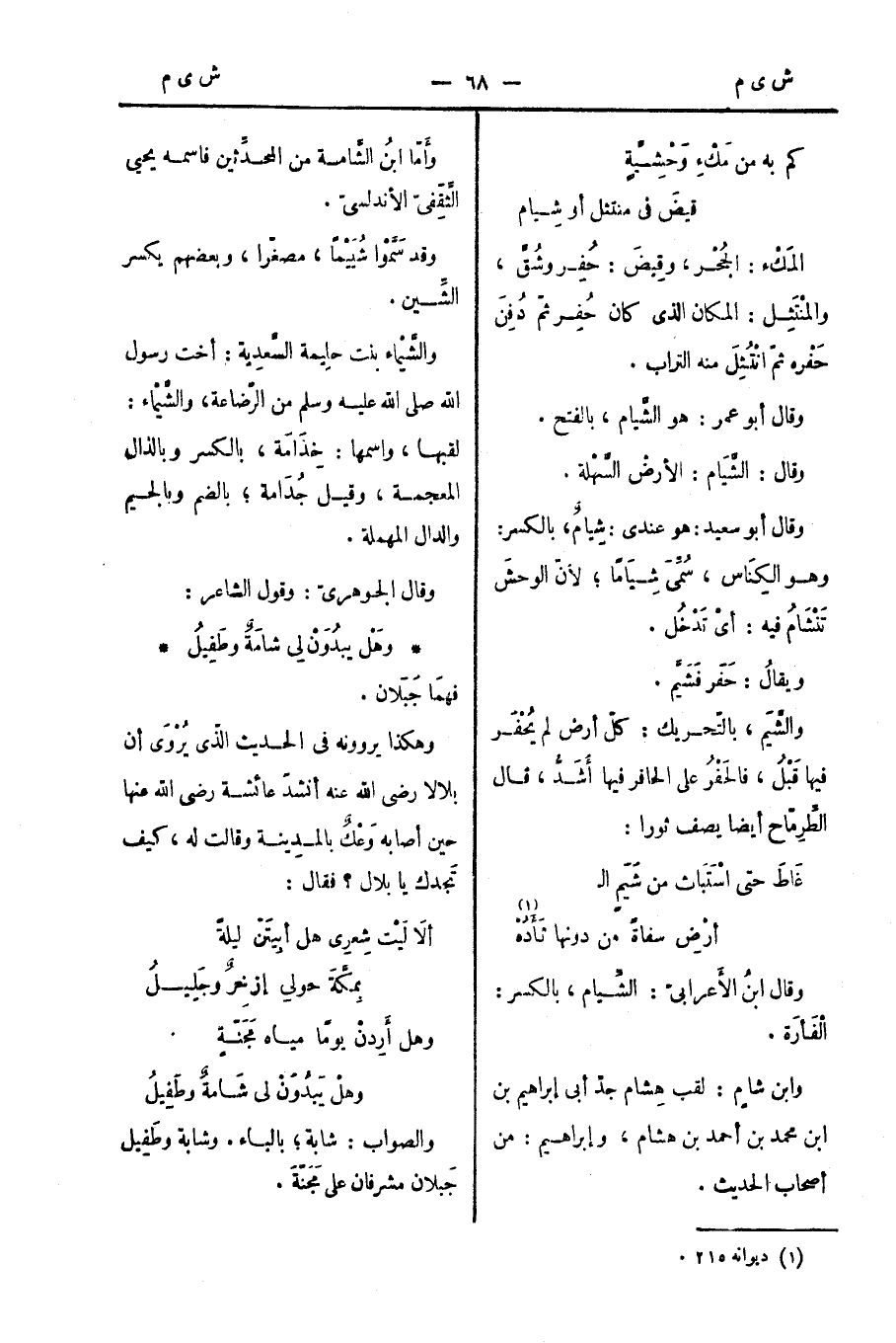 وقال أبو سعيد: هو عندي: شِيامٌ، بالكسر: وهو الكِنَاس، سُمِّي شِيَامًا؛ لأنّ الوحشَ تَنْشَامُ فيه: أيْ تَدْخُل.