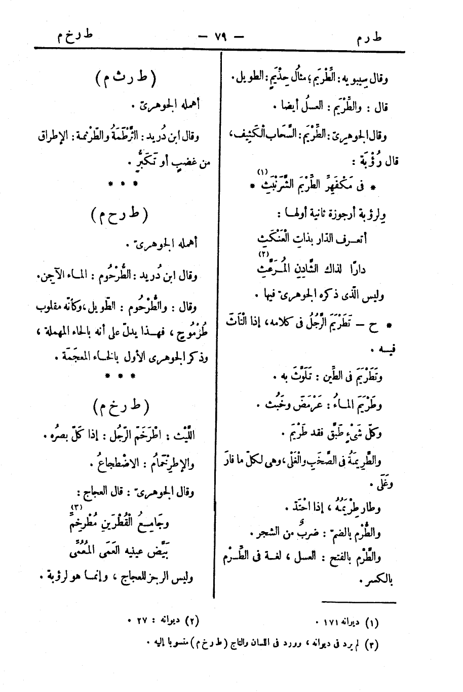 وقال: والطُّرْحُوم: الطّويل، وكأنّه مقلوب طُرْمُوحٍ، فهذا يدلّ على أنه بالحاء المهملة، وذكر الجوهري الأول بالخاء المعجَمَة.