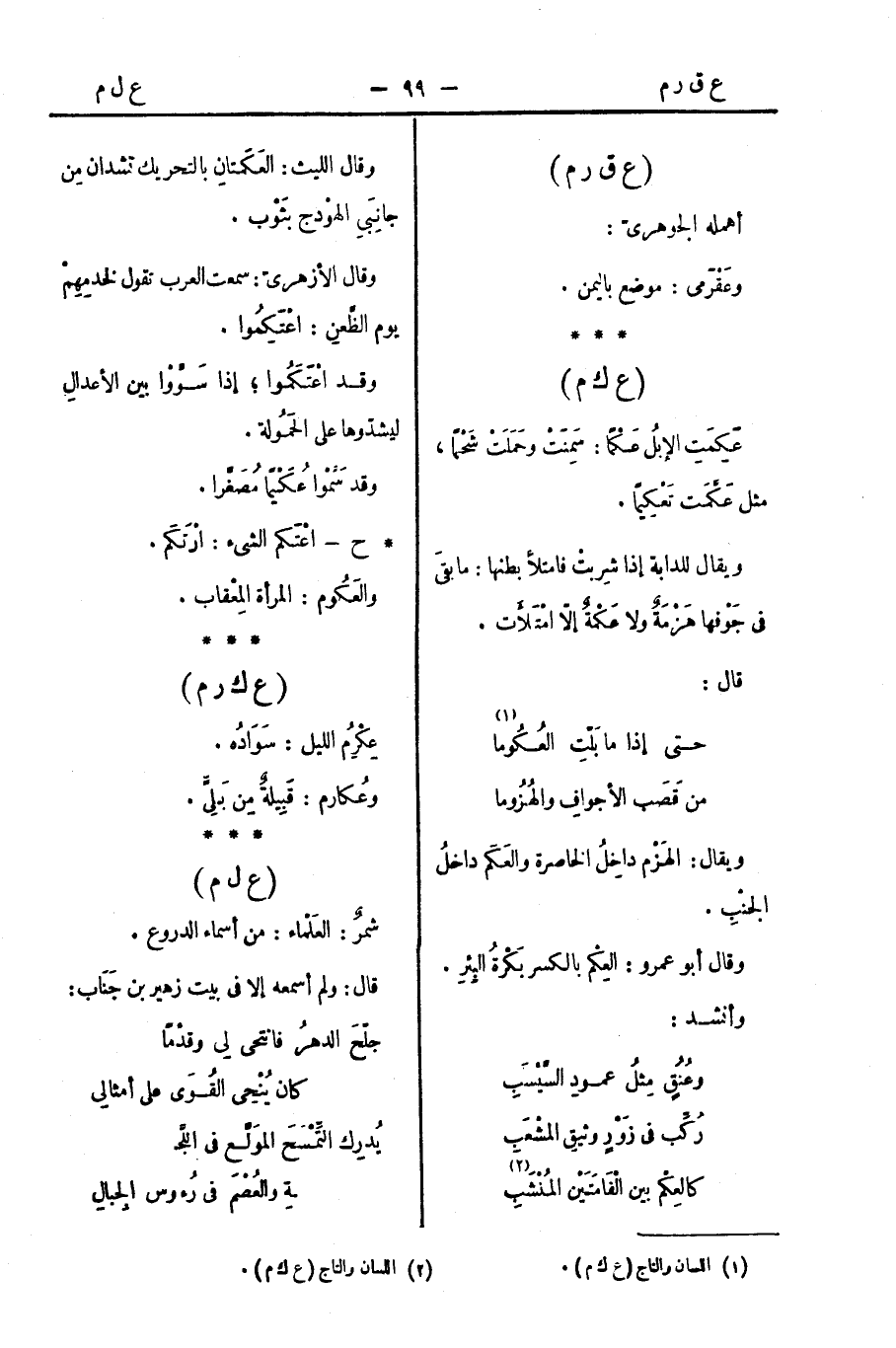 وقال الليث: العَكَمتانِ بالتحريك تشدان من جانِبَيِ الهوْدج بثَوْب.