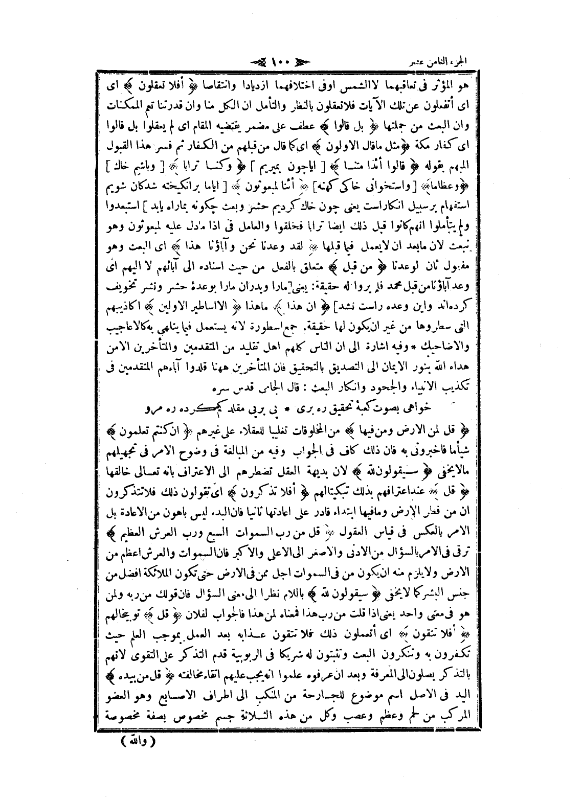 هو المؤثر فى تعاقبهما لا الشمس او فى اختلافهما ازديادا وانتقاصا أَفَلا تَعْقِلُونَ اى اى أتفعلون عن تلك الآيات فلا تعقلون بالنظر والتأمل ان الكل منا وان قدرتنا تعم الممكنات وان البعث من جملتها بَلْ قالُوا عطف على مضمر يقتضيه المقام اى لم يعقلوا بل قالوا اى كفار مكة مِثْلَ ما قالَ الْأَوَّلُونَ اى كما قال من قبلهم من الكفار ثم فسر هذا القبول المبهم بقوله قالُوا أَإِذا مِتْنا [آيا چون بميريم] وَكُنَّا تُراباً [وباشيم خاك] وَعِظاماً [واستخوانى خاكى كهنه] أَإِنَّا لَمَبْعُوثُونَ [آيا ما برانگيخته شدكان شويم استفهام بر سبيل انكار است يعنى چون خاك كرديم حشر وبعث چكونه بما راه يابد] استبعدوا ولم يتأملوا انهم كانوا قبل ذلك ايضا ترابا فخلقوا والعامل فى إذا ما دل عليه لمبعوثون وهو نبعث لان ما بعد ان لا يعمل فيما قبلها لَقَدْ وُعِدْنا نَحْنُ وَآباؤُنا هذا اى البعث وهو مفعول ثان لوعدنا مِنْ قَبْلُ متعلق بالفعل من حيث اسناده الى آبائهم لا إليهم اى وعد آباؤنا من قبل محمد فلم يروا له حقيقة: يعنى [ما را و پدران ما را بوعده حشر ونشر تخويف كرده اند واين وعده راست نشد] إِنْ هذا ما هذا إِلَّا أَساطِيرُ الْأَوَّلِينَ أكاذيبهم التي سطروها من غير ان يكون لها حقيقة. جمع اسطورة لانه يستعمل فيما يتلهى به كالاعاجيب والاضاحيك وفيه اشارة الى ان الناس كلهم اهل تقليد من المتقدمين والمتأخرين إلا من هداه الله بنور الايمان الى التصديق بالتحقيق فان المتأخرين هاهنا قلدوا آباءهم المتقدمين فى تكذيب الأنبياء والجحود وانكار البعث: قال الجامى قدس سره