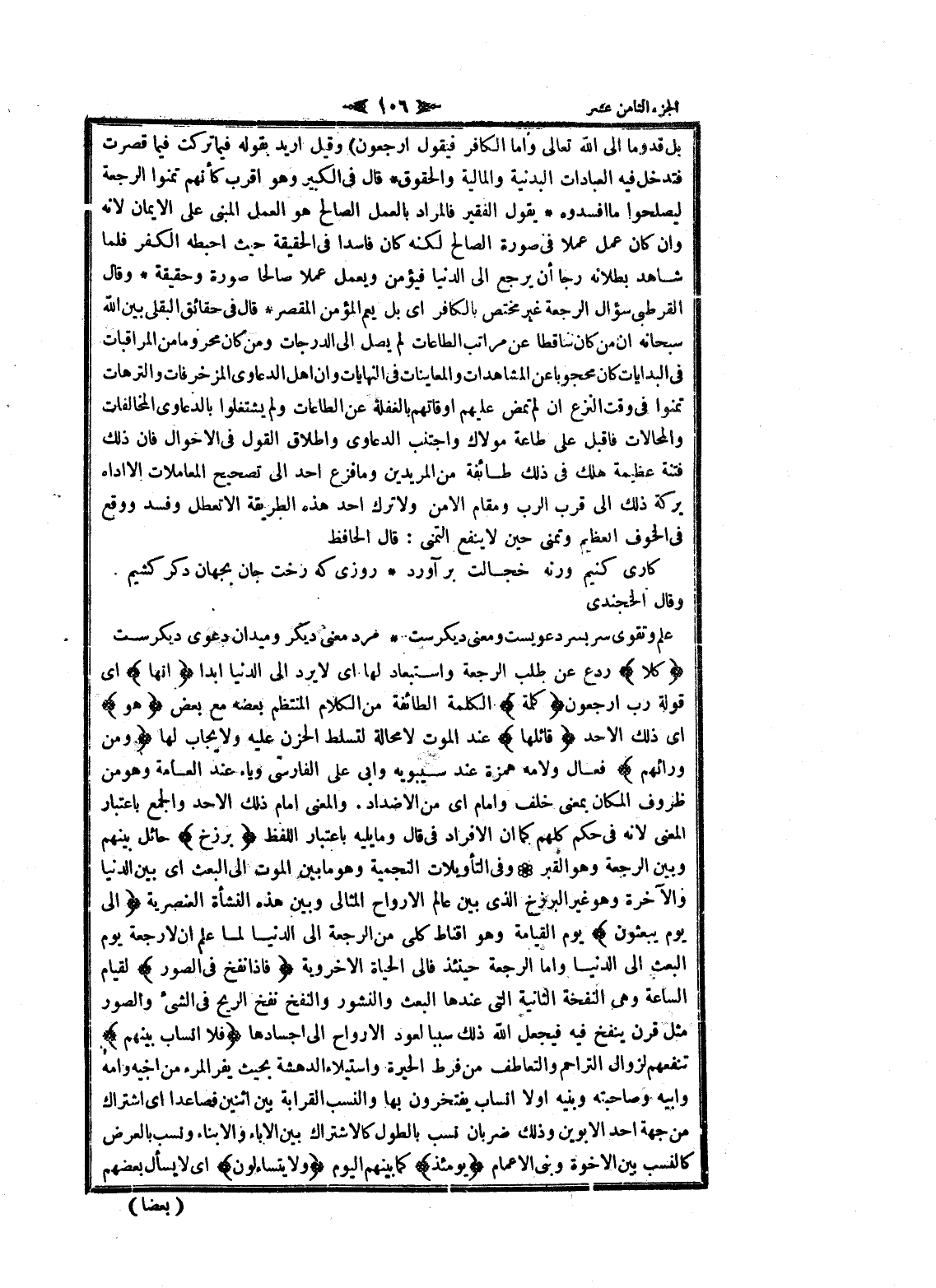 بل قدوما الى الله تعالى واما الكافر فيقول ارجعون) وقيل أريد بقوله فيما تركت فيما قصرت فتدخل فيه العبادات البدنية والمالية والحقوق قال فى الكبير وهو اقرب كأنهم تمنوا الرجعة ليصلحوا ما أفسدوه يقول الفقير فالمراد بالعمل الصالح هو العمل المبنى على الايمان لانه وان كان عمل عملا فى صورة الصالح لكنه كان فاسدا فى الحقيقة حيث احبطه الكفر فلما شاهد بطلانه رجا أن يرجع الى الدنيا فيؤمن ويعمل عملا صالحا صورة وحقيقة وقال القرطبي سؤال الرجعة غير مختص بالكافر اى بل يعم المؤمن المقصر قال فى حقائق البقلى بين الله سبحانه ان من كان ساقطا عن مراتب الطاعات لم يصل الى الدرجات ومن كان محروما من المراقبات فى البدايات كان محجوبا عن المشاهدات والمعاينات فى النهايات وان اهل الدعاوى المزخرفات والترهات تمنوا فى وقت النزع ان لم تمض عليهم أوقاتهم بالغفلة عن الطاعات ولم يشتغلوا بالدعاوى المخالفات والمحالات فاقبل على طاعة مولاك واجتنب الدعاوى واطلاق القول فى الأحوال فان ذلك فتنة عظيمة هلك فى ذلك طائفة من المريدين وما فزع أحد الى تصحيح المعاملات الا اداه بركة ذلك الى قرب الرب ومقام الامن ولا ترك أحد هذه الطريقة الا تعطل وفسد ووقع فى الخوف العظيم وتمنى حين لا ينفع التمني: قال الحافظ
