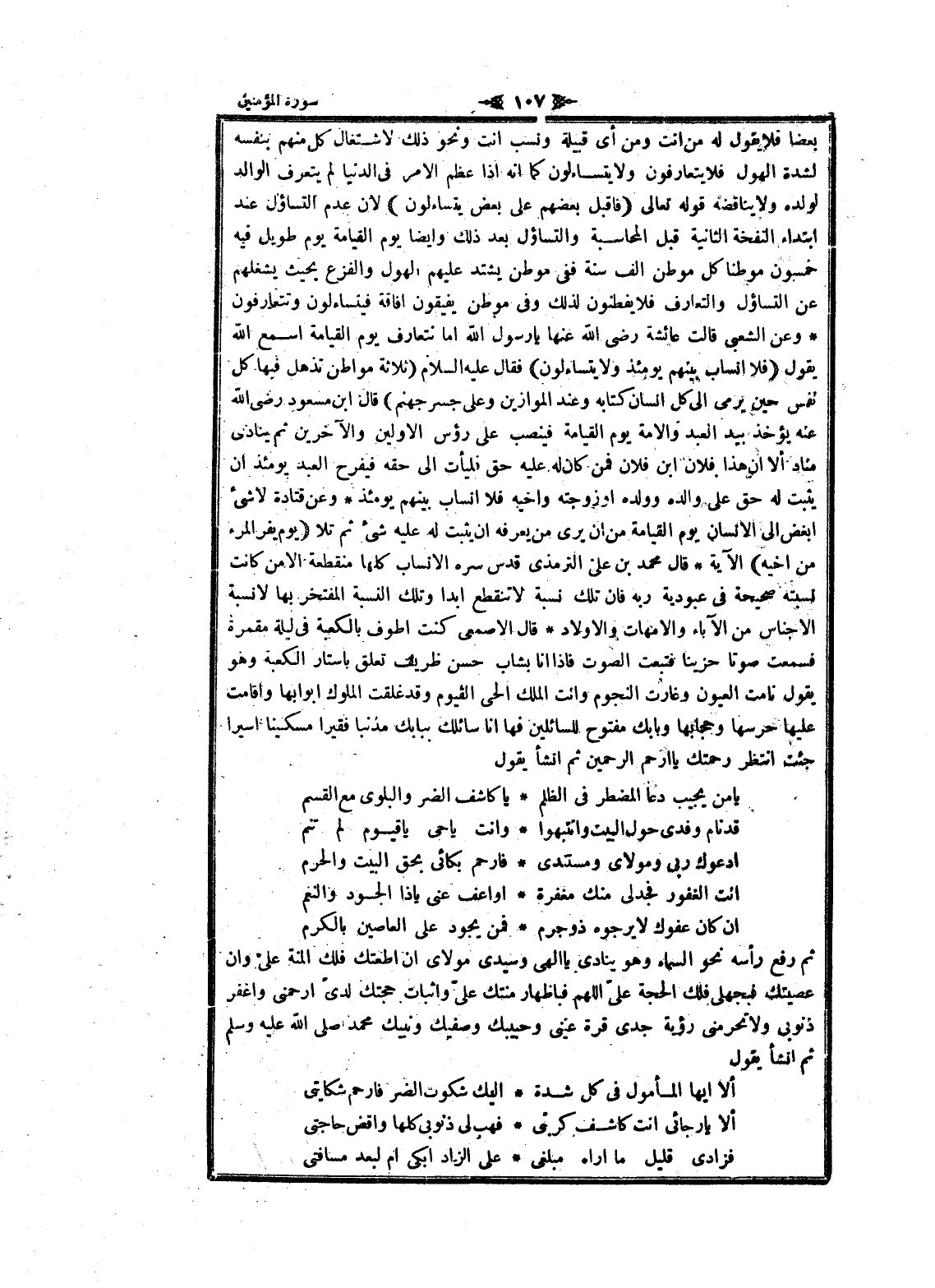 بعضا فلا يقول له من أنت ومن أي قبيلة ونسب أنت ونحو ذلك لاشتغال كل منهم بنفسه لشدة الهول فلا يتعارفون ولا يتساءلون كما انه إذا عظم الأمر فى الدنيا لم يتعرف الوالد لولده ولا يناقضه قوله تعالى (فَأَقْبَلَ بَعْضُهُمْ عَلى بَعْضٍ يَتَساءَلُونَ) لان عدم التساؤل عند ابتداء النفخة الثانية قبل المحاسبة والتساؤل بعد ذلك وايضا يوم القيامة يوم طويل فيه خمسون موطنا كل موطن الف سنة ففى موطن يشتد عليهم الهول والفزع بحيث يشغلهم عن التساؤل والتعارف فلا يفطنون لذلك وفى موطن يفيقون افاقة فيتساءلون وتتعارفون وعن الشعبي قالت عائشة رضى الله عنها يا رسول الله اما نتعارف يوم القيامة اسمع الله يقول (فَلا أَنْسابَ بَيْنَهُمْ يَوْمَئِذٍ وَلا يَتَساءَلُونَ) فقال عليه السلام (ثلاثة مواطن تذهل فيها كل نفس حين يرمى الى كل انسان كتابه وعند الموازين وعلى جسر جهنم) قال ابن مسعود رضى الله عنه يؤخذ بيد العبد والامة يوم القيامة فينصب على رؤس الأولين والآخرين ثم ينادى مناد ألا ان هذا فلان ابن فلان فمن كان له عليه حق فليأت الى