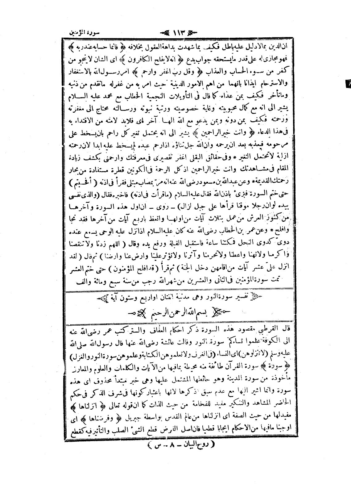 بسم الله الرحمن الرحيم قال القرطبي مقصود هذه السورة ذكر احكام العفاف والستر كتب عمر رضى الله عنه الى الكوفة علموا نساءكم سورة النور وقالت عائشة رضى الله عنها قال رسول الله صلى الله عليه وسلم (لا تنزلوهن) اى النساء (فى الغرف ولا تعلموهن الكتابة وعلموهن سورة النور والغزل) سُورَةٌ سورة القرآن طائفة منه محيطة بما فيها من الآيات والكلمات والعلوم والمعارف مأخوذة من سورة المدينة وهو حائطها المشتمل عليها وهى خبر مبتدأ محذوف اى هذه سورة وانما أشير إليها مع عدم سبق ذكرها لانها باعتبار كونها فى شرف الذكر فى حكم الحاضر المشاهد والتنكير مفيد للفخامة من حيث الذات كما ان قوله تعالى أَنْزَلْناها مفيد لها من حيث الصفة اى أنزلناها من عالم القدس بواسطة جبريل وَفَرَضْناها اى أوجبنا ما فيها من الاحكام إيجابا قطعيا فان اصل الفرض قطع الشيء الصلب والتأثير فيه كقطع
