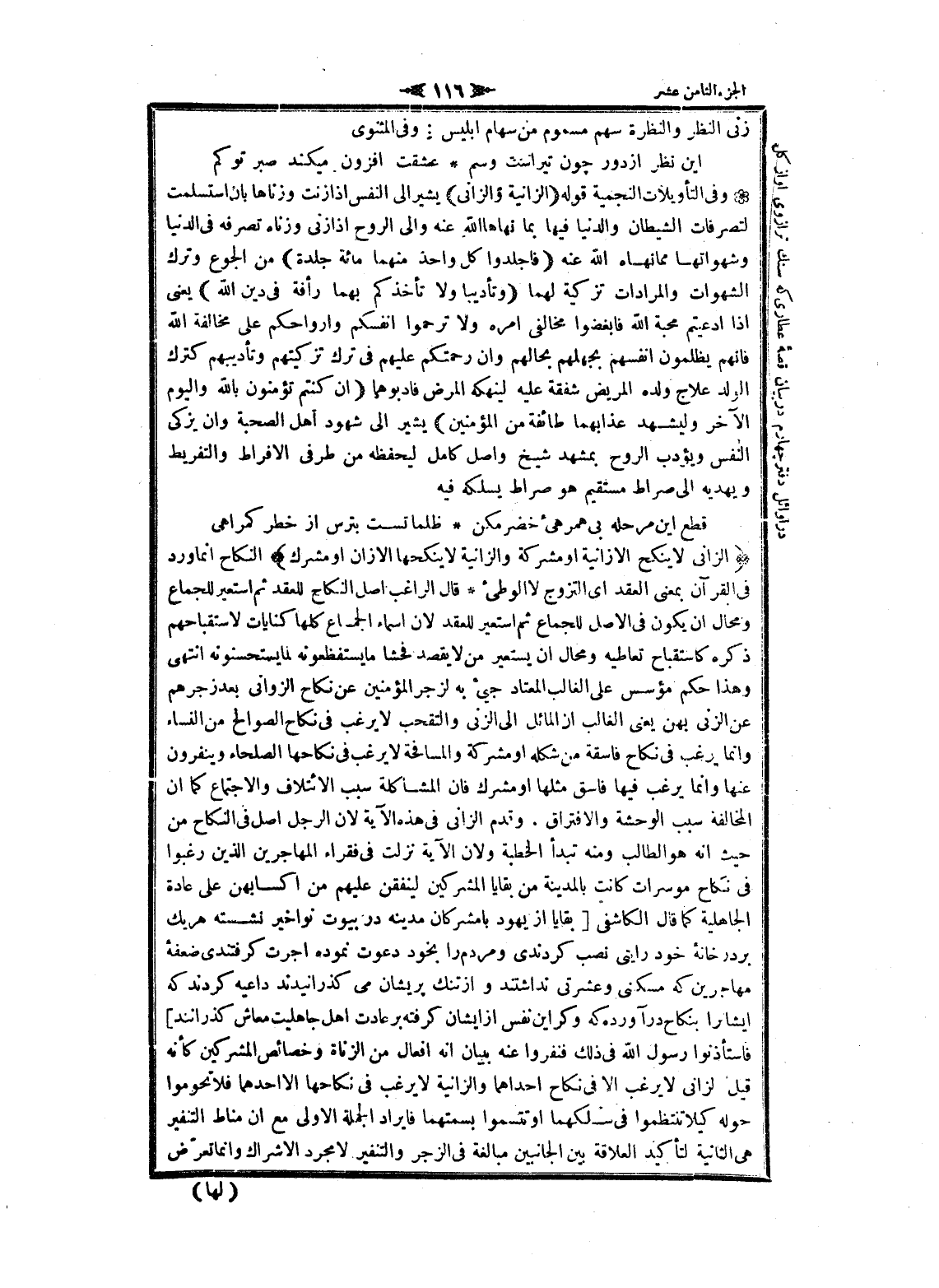 الزَّانِي لا يَنْكِحُ إِلَّا زانِيَةً أَوْ مُشْرِكَةً وَالزَّانِيَةُ لا يَنْكِحُها إِلَّا زانٍ أَوْ مُشْرِكٌ النكاح انما ورد فى القرآن بمعنى العقد اى التزوج لا الوطئ قال الراغب اصل النكاح للعقد ثم استعير للجماع ومحال ان يكون فى الأصل للجماع ثم استعير للعقد لان اسماء الجماع كلها كنايات لاستقباحهم ذكره كاستقباح تعاطيه ومحال ان يستعير من لا يقصد فحشا ما يستفظعونه لما يستحسنونه انتهى وهذا حكم مؤسس على الغالب المعتاد جيئ به لزجر المؤمنين عن نكاح الزواني بعد زجرهم عن الزاني بهن يعنى الغالب ان المائل الى الزنى والتقحب لا يرغب فى نكاح الصوالح من النساء وانما يرغب فى نكاح فاسقة من شكله او مشركة والمسافحة لا يرغب فى نكاحها الصلحاء وينفرون عنها وانما يرغب فيها فاسق مثلها او مشرك فان المشاكلة سبب الائتلاف والاجتماع كما ان المخالفة سبب الوحشة والافتراق. وقدم الزاني فى هذه الآية لان الرجل اصل فى النكاح من حيث انه هو الطالب ومنه تبدأ الخطبة ولان الآية نزلت فى فقراء المهاجرين الذين رغبوا فى نكاح موسرات كانت بالمدينة من بقايا المشركين لينفقن عليهم من اكسابهن على عادة الجاهلية كما قال الكاشفى [بقايا از يهود با مشركان مدينه در بيوت نواخير نشسته هر يك بر در خانه خود رايتى نصب كردندى ومردم را بخود دعوت نموده اجرت كرفتندى ضعفه مهاجرين كه مسكنى وعشرتى نداشتند واز تنك پريشان مى كذرانيدند داعيه كردند كه ايشانرا بنكاح درآورده كه وكر اين نفس از ايشان كرفته بر عادت اهل جاهليت معاش كذرانند] فاستأذنوا رسول الله فى ذلك فنفروا عنه ببيان انه افعال من الزناة وخصائص المشركين كأنه قيل الزاني لا يرغب الا فى نكاح إحداهما والزانية لا يرغب فى نكاحها الا أحدهما فلا تحوموا حوله كيلا تنتظموا فى سلكهما او تتسموا بسمتهما فايراد الجملة الاولى مع ان مناط التنفير هى الثانية لتأكيد العلاقة بين الجانبين مبالغة فى الزجر والتنفير لا مجرد الإشراك وانما تعرّض