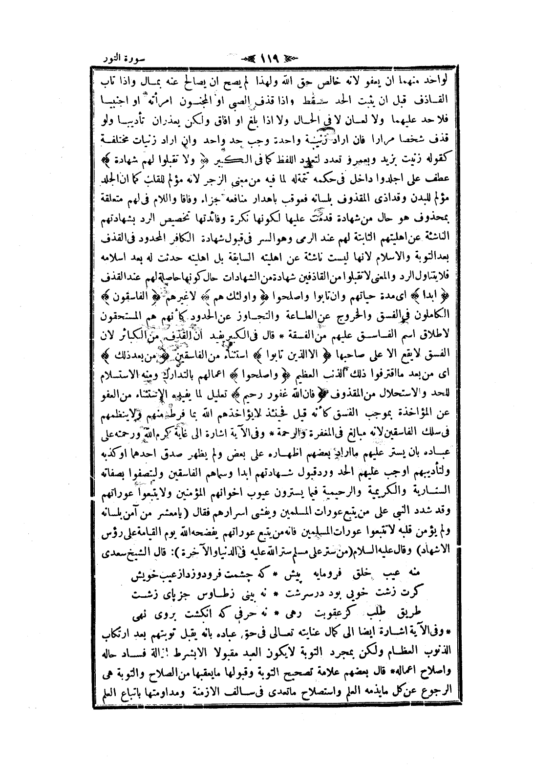 لواحد منهما ان يعفو لانه خالص حق الله ولهذا لم يصح ان يصالح عنه بمال وإذا تاب القاذف قبل ان يثبت الحد سقط وإذا قذف الصبى او المجنون امرأته او أجنبيا فلا حد عليهما ولا لعان لا فى الحال ولا إذا بلغ او أفاق ولكن يعذران تأديبا ولو قذف شخصا مرارا فان أراد زنية واحدة وجب حد واحد وان أراد زنيات مختلفة كقوله زنيت بزيد وبعمرو تعدد لتعدد اللفظ كما فى الكبير وَلا تَقْبَلُوا لَهُمْ شَهادَةً عطف على اجلدوا داخل فى حكمه تتمة له لما فيه من معنى الزجر لانه مؤلم للقلب كما ان الجلد مؤلم للبدن وقد أذى المقذوف بلسانه فعوقب باهدار منافعه جزاء وفاقا واللام فى لهم متعلقة بمحذوف هو حال من شهادة قدمت عليها لكونها نكرة وفائدتها تخصيص الرد بشهادتهم الناشئة عن اهليتهم الثابتة لهم عند الرمي وهو السر فى قبول شهادة الكافر المحدود فى القذف بعد التوبة والإسلام لانها ليست ناشئة عن أهليته السابقة بل أهليته حدثت له بعد إسلامه فلا يتناول الرد والمعنى لا تقبلوا من القاذفين شهادة من الشهادات حال كونها حاصلة لهم عند القذف أَبَداً اى مدة حياتهم وان تابوا وأصلحوا وَأُولئِكَ هُمُ لا غيرهم الْفاسِقُونَ الكاملون فى الفسق والخروج عن الطاعة والتجاوز عن الحدود كأنهم هم المستحقون لاطلاق اسم الفاسق عليهم من الفسقة قال فى الكبير يفيد ان القذف من الكبائر لان الفسق لا يقع الا على صاحبها إِلَّا الَّذِينَ تابُوا استثناء من الفاسقين مِنْ بَعْدِ ذلِكَ اى من بعد ما اقترفوا ذلك الذنب العظيم وَأَصْلَحُوا أعمالهم بالتدارك ومنه الاستسلام للحد والاستحلال من المقذوف فَإِنَّ اللَّهَ غَفُورٌ رَحِيمٌ تعليل لما يفيده الاستثناء من العفو عن المؤاخذة بموجب الفسق كأنه قيل فحينئذ لا يؤاخذهم الله بما فرط منهم ولا ينظمهم فى سلك الفاسقين لانه مبالغ فى المغفرة والرحمة وفى الآية اشارة الى غاية كرم الله ورحمته على عباده بان يستر عليهم ما أراد بعضهم إظهاره على بعض ولم يظهر صدق أحدهما او كذبه ولتأديبهم أوجب عليهم الحد ورد قبول شهادتهم ابدا وسماهم الفاسقين وليتصفوا بصفاته السارية والكريمية والرحيمية فيما يسترون عيوب إخوانهم المؤمنين ولا يتبعوا عوراتهم وقد شدد النبي على من يتبع عورات المسلمين ويفشى أسرارهم فقال (يا معشر من آمن بلسانه ولم يؤمن قلبه لا تتبعوا عورات المسلمين فانه من يتبع عوراتهم يفضحه الله يوم القيامة على رؤس الاشهاد) وقال عليه السلام (من ستر على مسلم ستر الله عليه فى الدنيا والآخرة) : قال الشيخ سعدى