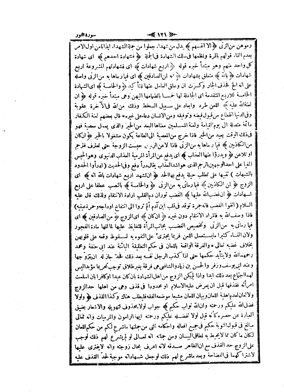 رموهن من الزنى إِلَّا أَنْفُسُهُمْ يدل من شهداء جعلوا من جملة الشهداء إيذانا من أول الأمر بعدم إلقاء قولهم بالمرة ونظمها فى سلك الشهادة فى الجملة فَشَهادَةُ أَحَدِهِمْ اى شهادة كل واحد منهم وهو مبتدأ خبره قوله أَرْبَعُ شَهاداتٍ اى فشهادتهم المشروعة اربع شهادات بِاللَّهِ متعلق بشهادات إِنَّهُ لَمِنَ الصَّادِقِينَ اى فيما رماها به من الزنى وأصله على انه إلخ فحذف الجار وكسرت ان وعلق العامل عنها للتأكيد وَالْخامِسَةُ اى الشهادة الخامسة للاربع المتقدمة اى الجاعلة لها خمسا بانضمامها إليهن وهى مبتدأ خبره قوله أَنَّ لَعْنَتَ اللَّهِ عَلَيْهِ اللعن طرد وابعاد على سبيل السخط وذلك من الله فى الآخرة عقوبة وفى الدنيا انقطاع من قبول فيضه وتوفيقه ومن الإنسان دعاء على غيره قال بعضهم لعنة الكفار دائمة متصلة الى يوم القيامة ولعنة المسلمين معناها البعد من الخير والذي يعمل معصية فهو فى ذلك الوقت بعيد من الخير فاذا خرج من المعصية الى الطاعة يكون مشغولا بالخير إِنْ كانَ مِنَ الْكاذِبِينَ فيما رماها به من الزنى فاذا لاعن الرجل حبست الزوجة حتى تعترف فترجم او تلاعن وَيَدْرَؤُا عَنْهَا الْعَذابَ اى يدفع عن المرأة المرمية العذاب الدنيوي وهو الحبس المغيا على أحد الوجهين بالرجم الذي هو أشد العذاب يقال درأ دفع وفى الحديث (ادرأوا الحدود بالشبهات) تنبيها على تطلب حيلة يدفع بها الحد أَنْ تَشْهَدَ أَرْبَعَ شَهاداتٍ بِاللَّهِ إِنَّهُ اى الزوج لَمِنَ الْكاذِبِينَ فيما رمانى به من الزنى وَالْخامِسَةَ بالنصب عطفا على اربع شهادات أَنَّ غَضَبَ اللَّهِ عَلَيْها الغضب ثوران دم القلب ارادة الانتقام ولذلك قال عليه السلام (اتقوا الغضب فانه جمرة توقد فى قلب ابن آدم ألم تروا الى انتفاخ أوداجه وحمرة عينيه) فاذا وصف الله به فالمراد الانتقام دون غيره إِنْ كانَ اى الزوج مِنَ الصَّادِقِينَ اى فيما رمانى به من الزنى وتخصيص الغضب بجانب المرأة للتغليظ عليها لما انها مادة الفجور ولان النساء كثيرا ما يستعمل اللعن فربما يجترئ على التفوه به لسقوط وقعه على قلوبهن بخلاف غضبه تعالى والفرقة الواقعة باللعان فى حكم التطليقة البائنة عند ابى حنفة ومحمد رحمهما الله ولا يتأبد حكمها حتى إذا كذب الرجل نفسه بعد ذلك فحدّ جاز له ان يتزوّجها وعند ابى يوسف وزفر والحسن بن زياد والشافعي هى فرقة بغير طلاق توجب تحريما مؤبد أليس لهما اجتماع بعد ذلك ابدا وإذا لم يكن الزوج من اهل الشهادة بان كان عبدا او كافرا بان أسلمت امرأته فقذفها قبل ان يعرض عليه السلام او محدودا فى قذف وهى من أهلها حد الزوج ولا لعان لعدم اهلية اللعان وبيان اللعان مشبعا موضعه الفقه فليطلب هناك وكذا القذف وَلَوْلا فَضْلُ اللَّهِ عَلَيْكُمْ وَرَحْمَتُهُ وَأَنَّ اللَّهَ تَوَّابٌ حَكِيمٌ جواب لولا محذوف لتهويله والاشعار بضيق العبارة عن حصره كأنه قيل لولا تفضله عليكم ورحمته ايها الرامون والمرميات وانه تعالى مبالغ فى قبول التوبة حكيم فى جميع أفعاله وأحكامه التي من جملتها ما شرع لكم من حكم اللعان لكان ما كان مما لا يحيط به نطاق البيان ومن جملته انه تعالى لو لم يشرع لهم ذلك لوجب على الزوج حد القذف مع ان الظاهر صدقه لانه اعرف بحال زوجته وانه لا يفترى عليها لاشتراكهما فى الفضاحة وبعد ما شرع لهم ذلك لو جعل شهاداته موجبة لحدّ القذف عليه