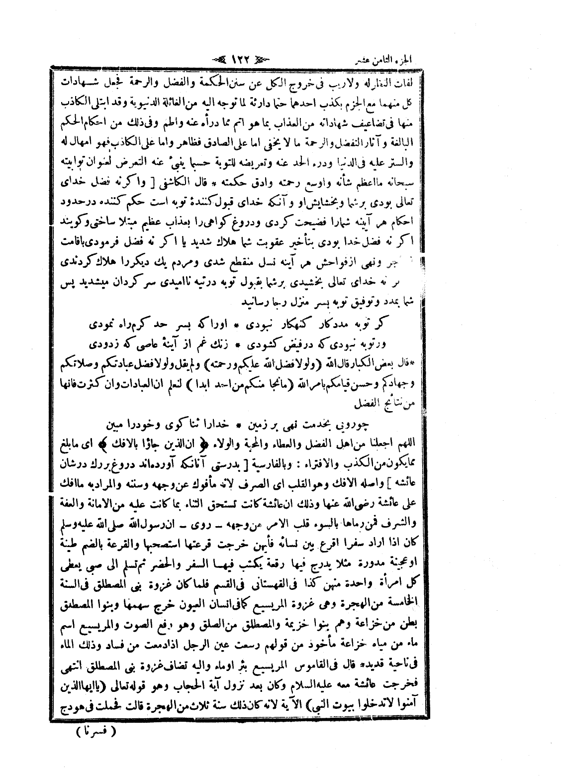 اللهم اجعلنا من اهل الفضل والعطاء والمحبة والولاء إِنَّ الَّذِينَ جاؤُ بِالْإِفْكِ اى ما بلغ مما يكون من الكذب والافتراء: وبالفارسية [بدرستى آنانكه آورده اند دروغ برزك درشان عائشه] وأصله الافك وهو القلب اى الصرف لانه مأفوك عن وجهه وسننه والمراد به ما افك على عائشة رضى الله عنها وذلك ان عائشة كانت تستحق الثناء بما كانت عليه من الامانة والعفة والشرف فمن رماها بالسوء قلب الأمر من وجهه- روى- ان رسول الله صلى الله عليه وسلم كان إذا أراد سفرا اقرع بين نسائه فأيهن خرجت قرعتها استصحبها والقرعة بالضم طينة او عجينة مدورة مثلا يدرج فيها رقعة يكتب فيها السفر والحضر ثم تسلم الى صبى يعطى كل امرأة واحدة منهن كذا فى القهستاني فى القسم فلما كان غزوة بنى المصطلق فى السنة الخامسة من الهجرة وهى غزوة المريسيع كما فى انسان العيون خرج سهمها وبنوا المصطلق بطن من خزاعة وهم بنوا خزيمة والمصطلق من الصلق وهو رفع الصوت والمريسيع اسم ماء من مياه خزاعة مأخوذ من قولهم رسعت عين الرجل إذا دمعت من فساد وذلك الماء فى ناحية قديد قال فى القاموس المريسيع بئر او ماء واليه تضاعف غزوة بنى المصطلق انتهى فخرجت عائشة معه عليه السلام وكان بعد نزول آية الحجاب وهو قوله تعالى (يا أَيُّهَا الَّذِينَ آمَنُوا لا تَدْخُلُوا بُيُوتَ النَّبِيِّ) الآية لانه كان ذلك سنة ثلاث من الهجرة قالت فحملت فى هودج