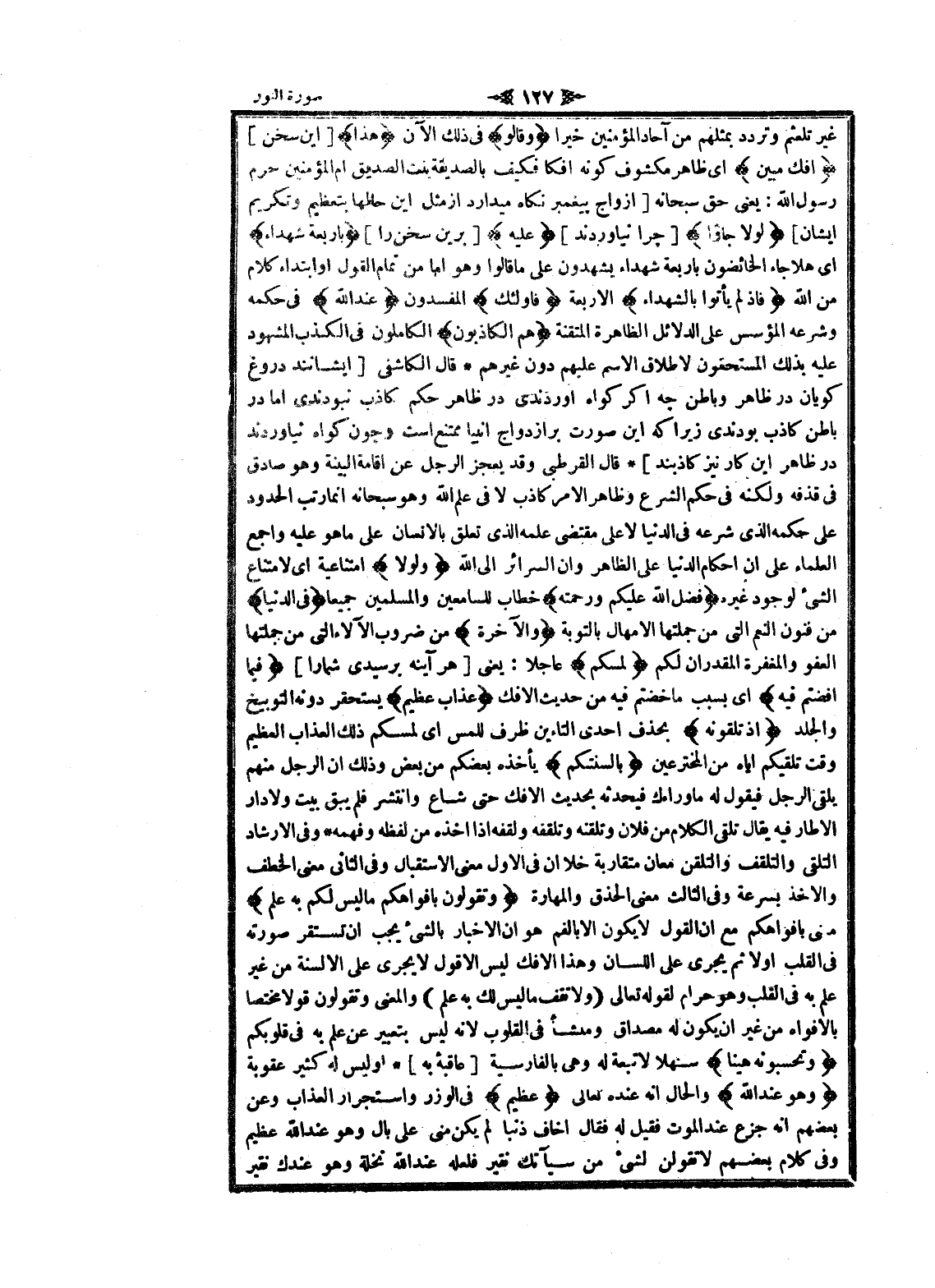 غير تلعثم وتردد بمثلهم من آحاد المؤمنين خيرا وَقالُوا فى ذلك الآن هذا [اين سخن] إِفْكٌ مُبِينٌ اى ظاهر مكشوف كونه إفكا فكيف بالصديقة بنت الصديق أم المؤمنين حرم رسول الله: يعنى حق سبحانه [ازواج پيغمبر نكاه ميدارد از مثل اين حالها بتعظيم وتكريم ايشان] لَوْلا جاؤُ [چرا نياوردند] عَلَيْهِ [برين سخن را] بِأَرْبَعَةِ شُهَداءَ اى هلا جاء الخائضون باربعة شهداء يشهدون على ما قالوا وهو اما من تمام القول او ابتداء كلام من الله فَإِذْ لَمْ يَأْتُوا بِالشُّهَداءِ الاربعة فَأُولئِكَ المفسدون عِنْدَ اللَّهِ فى حكمه وشرعه المؤسس على الدلائل الظاهرة المتقنة هُمُ الْكاذِبُونَ الكاملون فى الكذب المشهود عليه بذلك المستحقون لاطلاق الاسم عليهم دون غيرهم قال الكاشفى [ايشانند دروغ كويان در ظاهر وباطن چهـ اگر كواه آوردندى در ظاهر حكم كاذب نبودندى اما در باطن كاذب بودندى زيرا كه اين صورت بر ازدواج انبيا ممتنع است و چون كواه نياوردند در ظاهر اين كار نيز كاذبند] قال القرطبي وقد يعجز الرجل عن اقامة البينة وهو صادق فى قذفه ولكنه فى حكم الشرع وظاهر الأمر كاذب لا فى علم الله وهو سبحانه انما رتب الحدود على حكمه الذي شرعه فى الدنيا لا على مقتضى علمه الذي تعلق بالإنسان على ما هو عليه واجمع العلماء على ان احكام الدنيا على الظاهر وان السرائر الى الله وَلَوْلا امتناعية اى لامتناع الشيء لوجود غيره فَضْلُ اللَّهِ عَلَيْكُمْ وَرَحْمَتُهُ خطاب للسامعين والمسلمين جميعا فِي الدُّنْيا من فنون النعم التي من جملتها الامهال بالتوبة وَالْآخِرَةِ من ضروب الآلاء التي من جملتها العفو والمغفرة المقدران لكم لَمَسَّكُمْ عاجلا: يعنى [هر آينه برسيدى شما را] فِيما أَفَضْتُمْ فِيهِ اى بسبب ما خضتم فيه من حديث الافك عَذابٌ عَظِيمٌ يستحقر دونه التوبيخ والجلد إِذْ تَلَقَّوْنَهُ بحذف احدى التاءين ظرف للمس اى لمسكم ذلك العذاب العظيم وقت تلقيكم إياه من المخترعين بِأَلْسِنَتِكُمْ يأخذه بعضكم من بعض وذلك ان الرجل منهم يلقى الرجل فيقول له ما وراءك فيحدثه بحديث الافك حتى شاع وانتشر فلم يبق بيت ولادار الا طار فيه يقال تلقى الكلام من فلان وتلقنه وتلقفه ولقفه إذا اخذه من لفظه وفهمه وفى الإرشاد التلقي والتلقف والتلقن معان متقاربة خلا ان فى الاول معنى الاستقبال وفى الثاني معنى الخطف والاخذ بسرعة وفى الثالث معنى الحذق والمهارة وَتَقُولُونَ بِأَفْواهِكُمْ ما لَيْسَ لَكُمْ بِهِ عِلْمٌ معنى بأفواهكم مع ان القول لا يكون الا بالفم هو ان الاخبار بالشيء يجب ان تستقر صورته فى القلب اولا ثم يجرى على اللسان وهذا الافك ليس الا قول لا يجرى على الالسنة من غير علم به فى القلب وهو حرام لقوله تعالى (وَلا تَقْفُ ما لَيْسَ لَكَ بِهِ عِلْمٌ) والمعنى وتقولون قولا مختصا بالأفواه من غير ان يكون له مصداق ومنشأ فى القلوب لانه ليس بتعبير عن علم به فى قلوبكم وَتَحْسَبُونَهُ هَيِّناً سهلا لا تبعة له وهى بالفارسية [عاقبه به] او ليس له كثير عقوبة وَهُوَ عِنْدَ اللَّهِ والحال انه عنده تعالى عَظِيمٌ فى الوزر واستجرار العذاب وعن بعضهم انه جزع عند الموت فقيل له فقال أخاف ذنبا لم يكن منى على بال وهو عند الله عظيم وفى كلام بعضهم لا تقولن لشىء من سيآتك نقير فلعله عند الله نخلة وهو عندك نقير