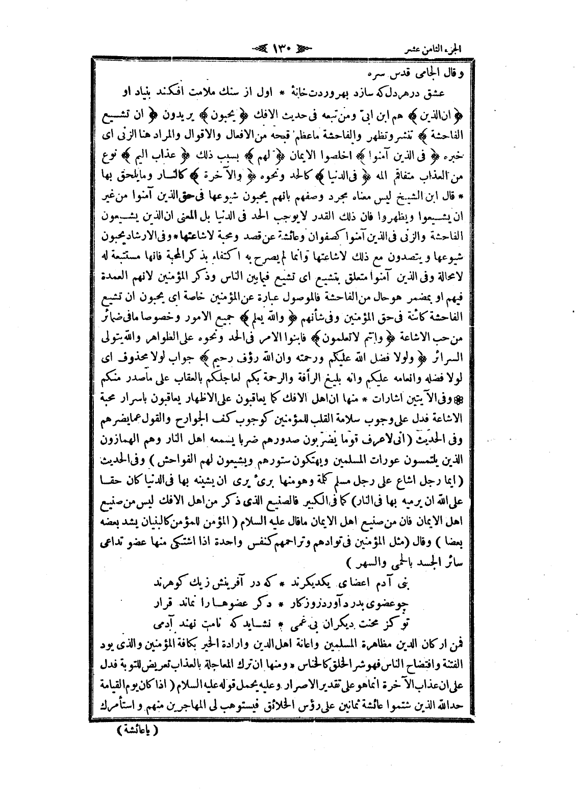 فمن اركان الدين مظاهرة المسلمين واعانة اهل الدين وارادة الخير بكافة المؤمنين والذي يود الفتنة وافتضاح الناس فهو شر الخلق كالخناس ومنها ان ترك المعاجلة بالعذاب تعريض للتوبة فدل على ان عذاب الآخرة انما هو على تقدير الإصرار وعليه يحمل قوله عليه السلام (إذا كان يوم القيامة حد الله الذين شتموا عائشة ثمانين على رؤس الخلائق فيستوهب لى المهاجرين منهم واستأمرك