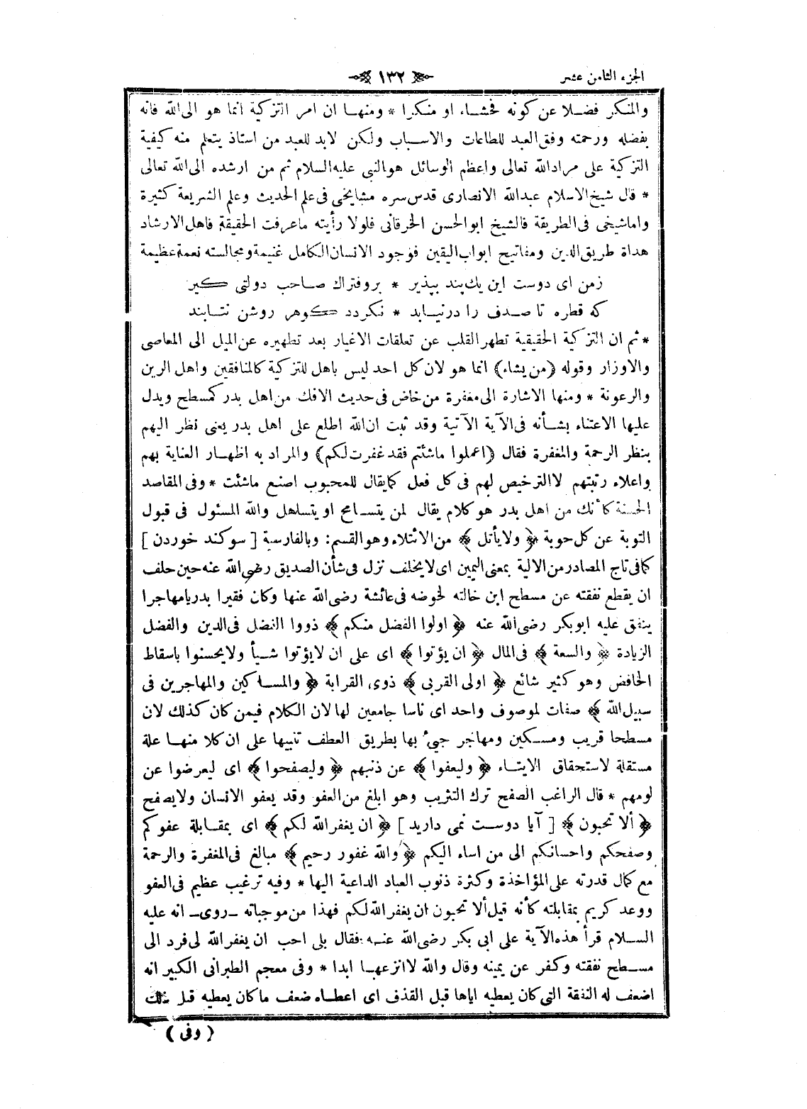 والمنكر فضلا عن كونه فحشاء او منكر او منها ان امر التزكية انما هو الى الله فانه بفضله ورحمته وفق العبد للطاعات والأسباب ولكن لا بد للعبد من أستاذ يتعلم منه كيفية التزكية على مراد الله تعالى وأعظم الوسائل هو النبي عليه السلام ثم من أرشده الى الله تعالى قال شيخ الإسلام عبد الله الأنصاري قدس سره مشايخى فى علم الحديث وعلم الشريعة كثيرة واما شيخى فى الطريقة فالشيخ ابو الحسن الخرقاني فلولا رأيته ما عرفت الحقيقة فاهل الإرشاد هداة طريق الدين ومفاتيح أبواب اليقين فوجود الإنسان الكامل غنيمة ومجالسته نعمة عظيمة